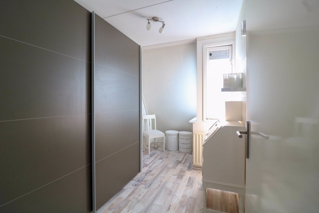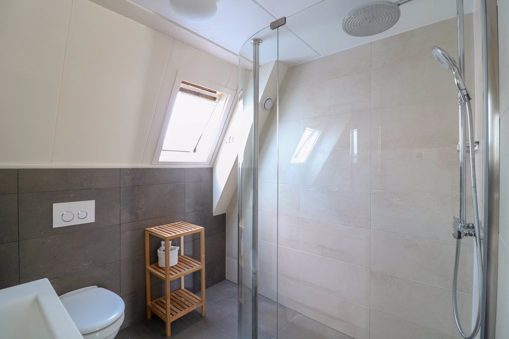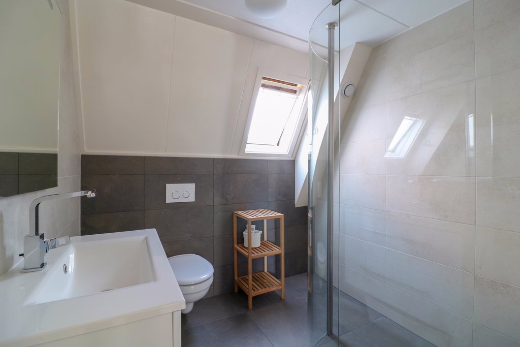In de derde slaapkamer staat een grote schuifkast, die eventueel kan worden overgenomen. De strakke badkamer is van 2012 en heeft een badmeubel, hangend toilet en een grote inloopdouche met regendouche. Met de elektrisch instelbare vloerverwarming heb je nooit last van koude voeten in de badkamer.