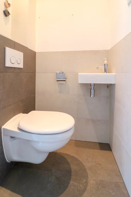Het moderne toilet is in 2012 nieuw geplaatst. In de schuur zit de wasmachine-aansluiting.