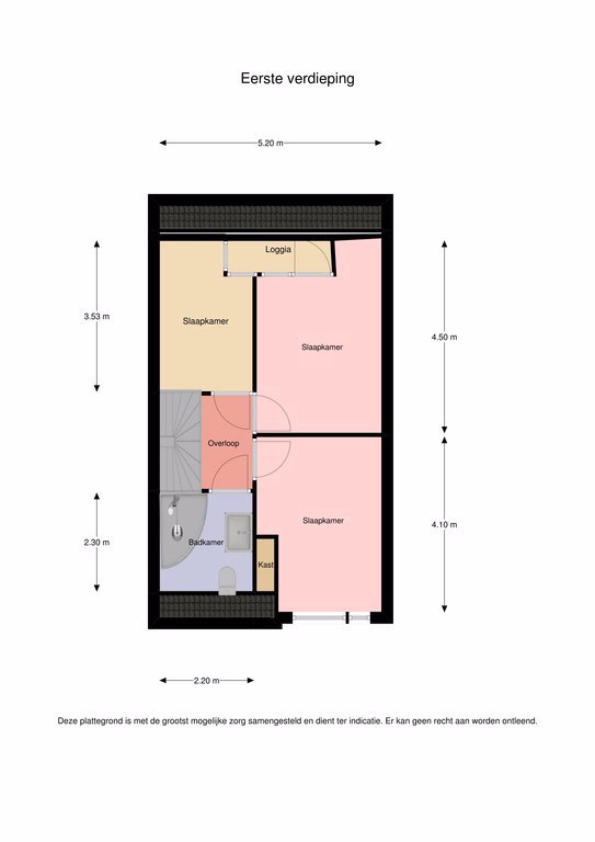 Via de trap, die is bekleed met laminaat, wordt de 1e verdieping bereikt waar zich 3 slaapkamers en de badkamer bevinden. De ouderslaapkamer geeft toegang tot de loggia/balkon en heeft vloerbedekking op de grond. De tweede slaapkamer aan de voorzijde van de woning heeft ook royale afmetingen en een handige inbouwkast.