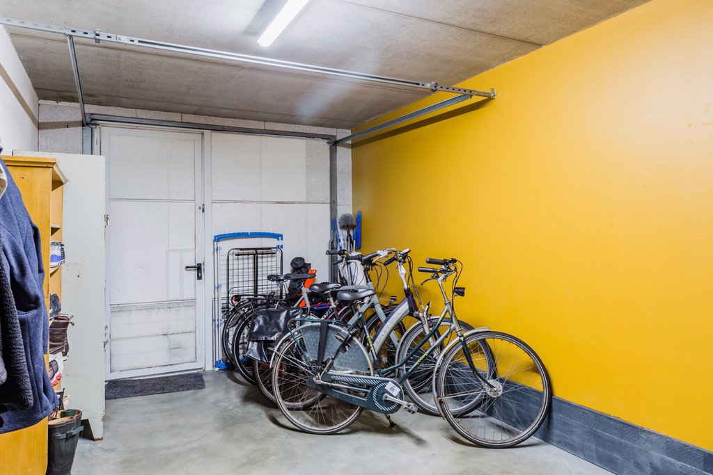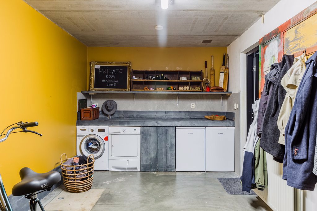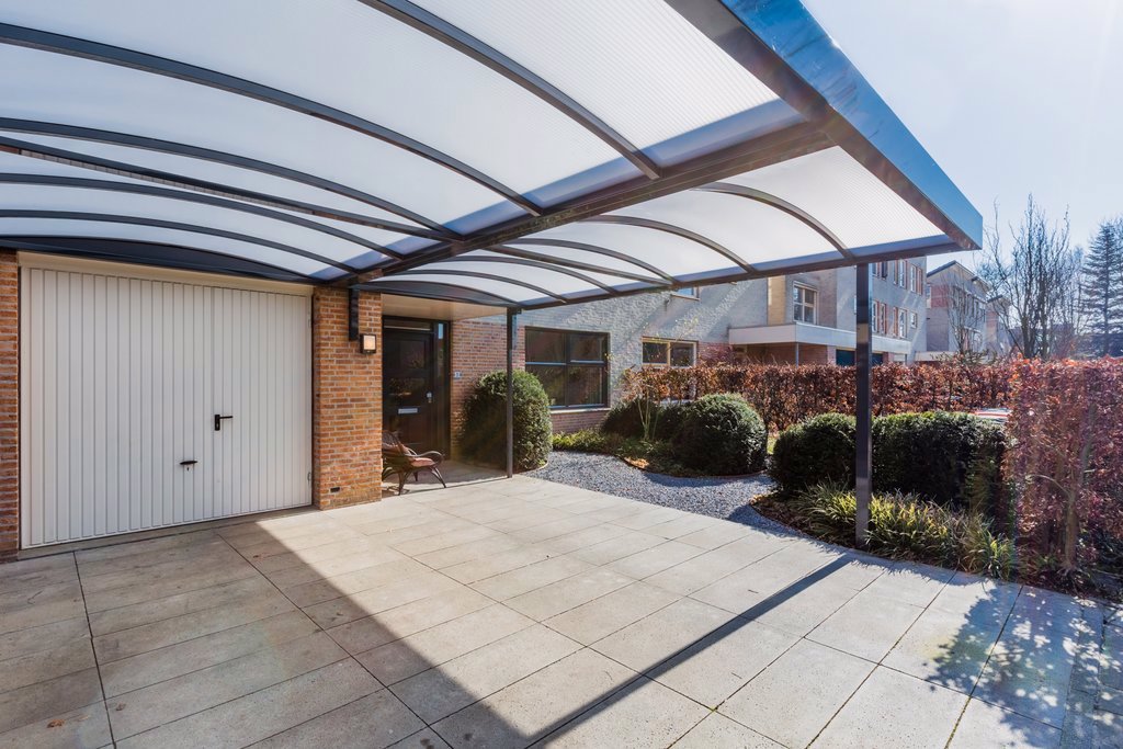 De inpandige garage is geïsoleerd en verwarmd. Hier vind je de aansluitingen voor de wasmachine en wasdroger. Voor de garage staat een grote carport waar 2 auto’s kunnen staan.