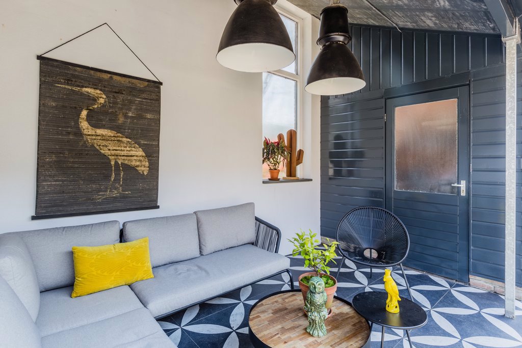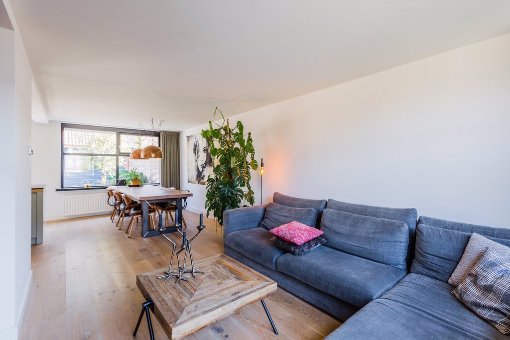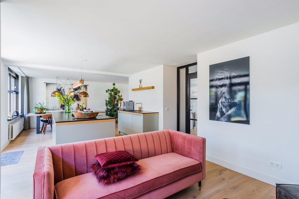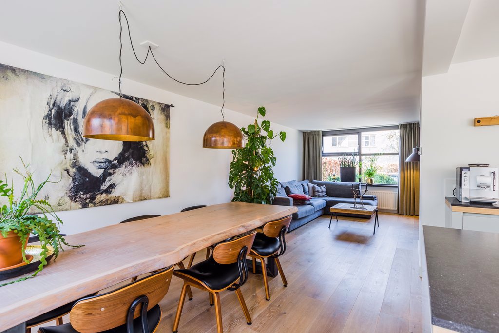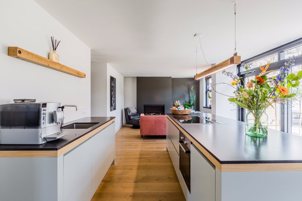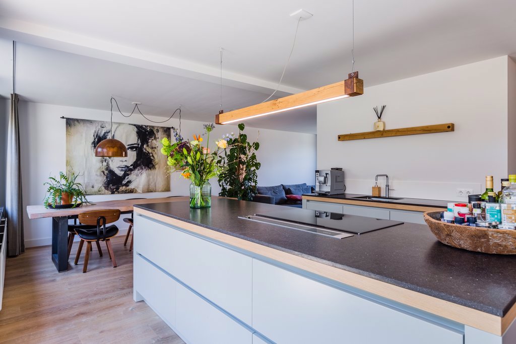 Doordat de keuken in het middengedeelte is geplaatst, heeft deze woning een unieke indeling met meerdere plekken. De maatwerkkeuken uit 2017 met moderne snufjes zoals een in het werkblad geïntegreerde afzuigkap, een 5-pits inductiekookplaat, Quooker, koelkast, oven en afwasmachine is de centrale plek in het huis. Omdat de ruimte boven het aanrecht open is gehouden, geniet je optimaal van het licht dat door de grote schuifpui naar binnen komt.