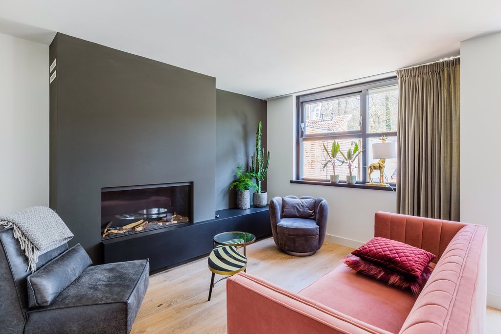 – Woonkamer met gashaard en schuifpui naar de tuin