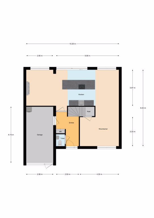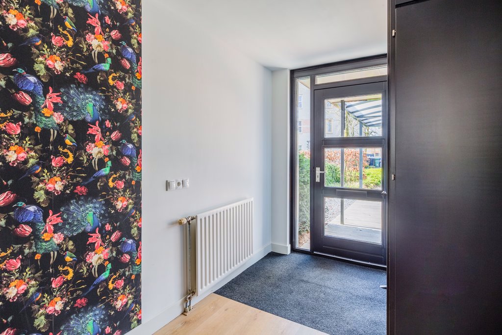 Bij binnenkomst valt gelijk de strakke afwerking op met de gestucte muren en plafonds, de houten vloer en de zwart geschilderde houten deuren en kozijnen. Vanuit de hal heb je toegang tot de inpandige garage, toilet, meterkast, trap naar de 1e verdieping en de woonkamer/keuken.