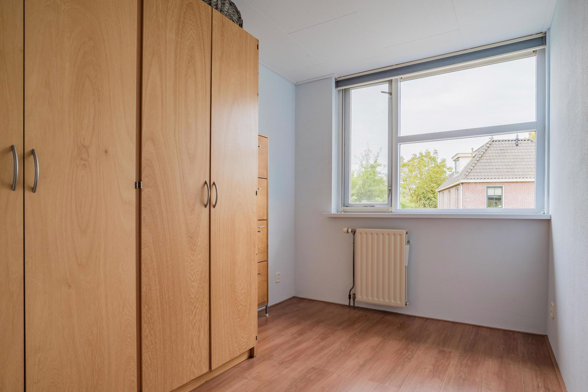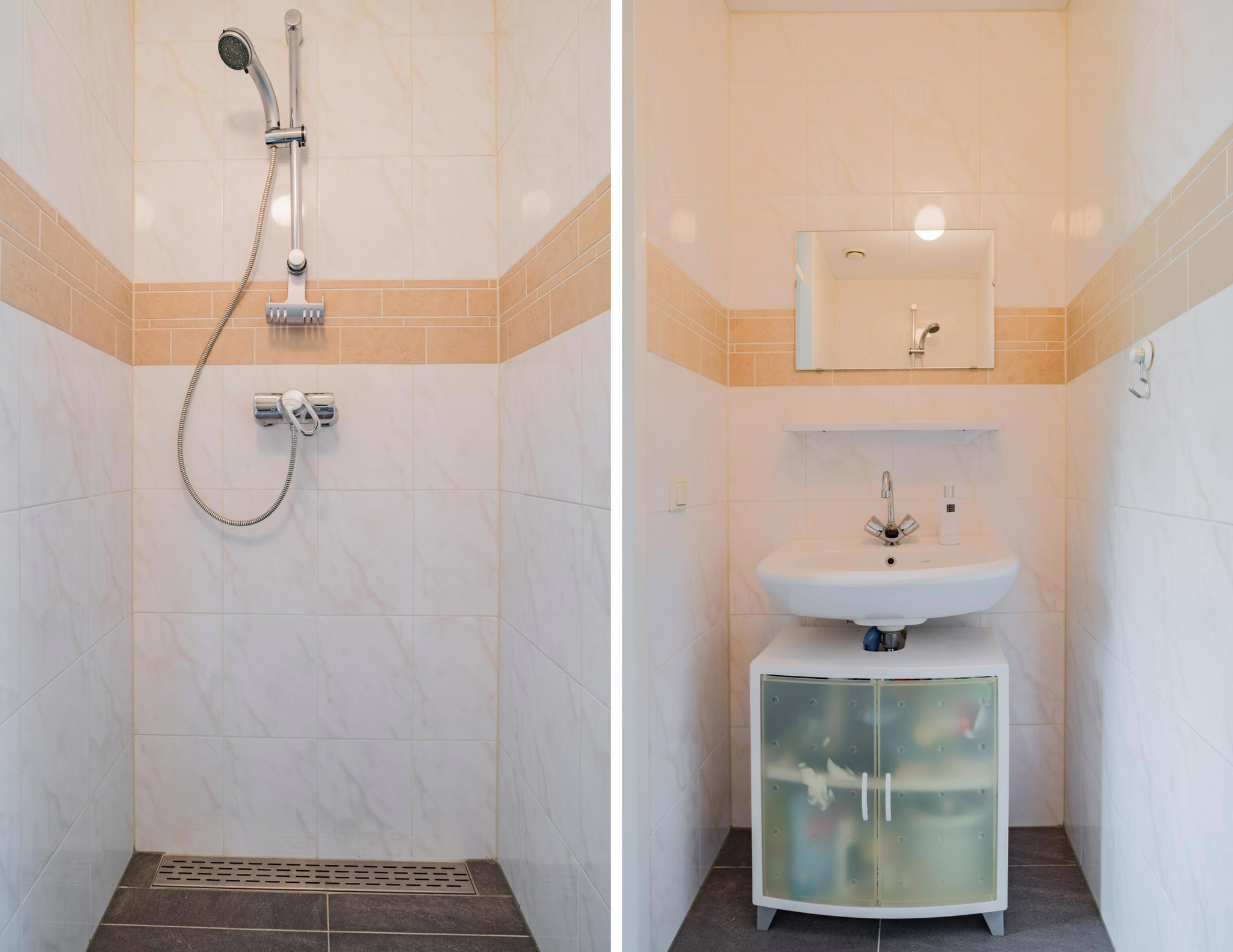 Naast de keuken ligt een slaapkamer. De huidige bewoners gebruiken deze ruimte als thuiswerkplek. De aangrenzende badkamer heeft een douche en wastafel.