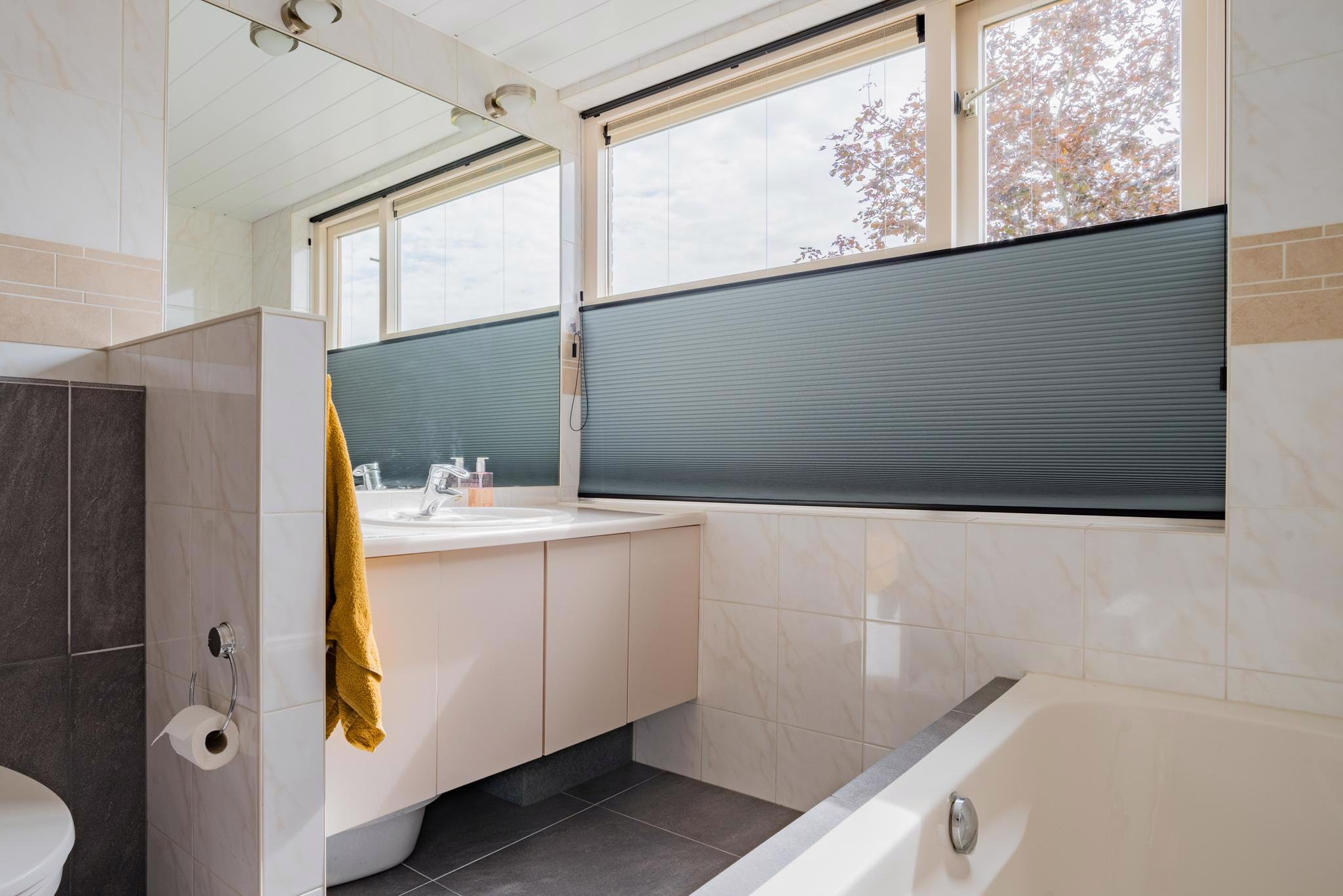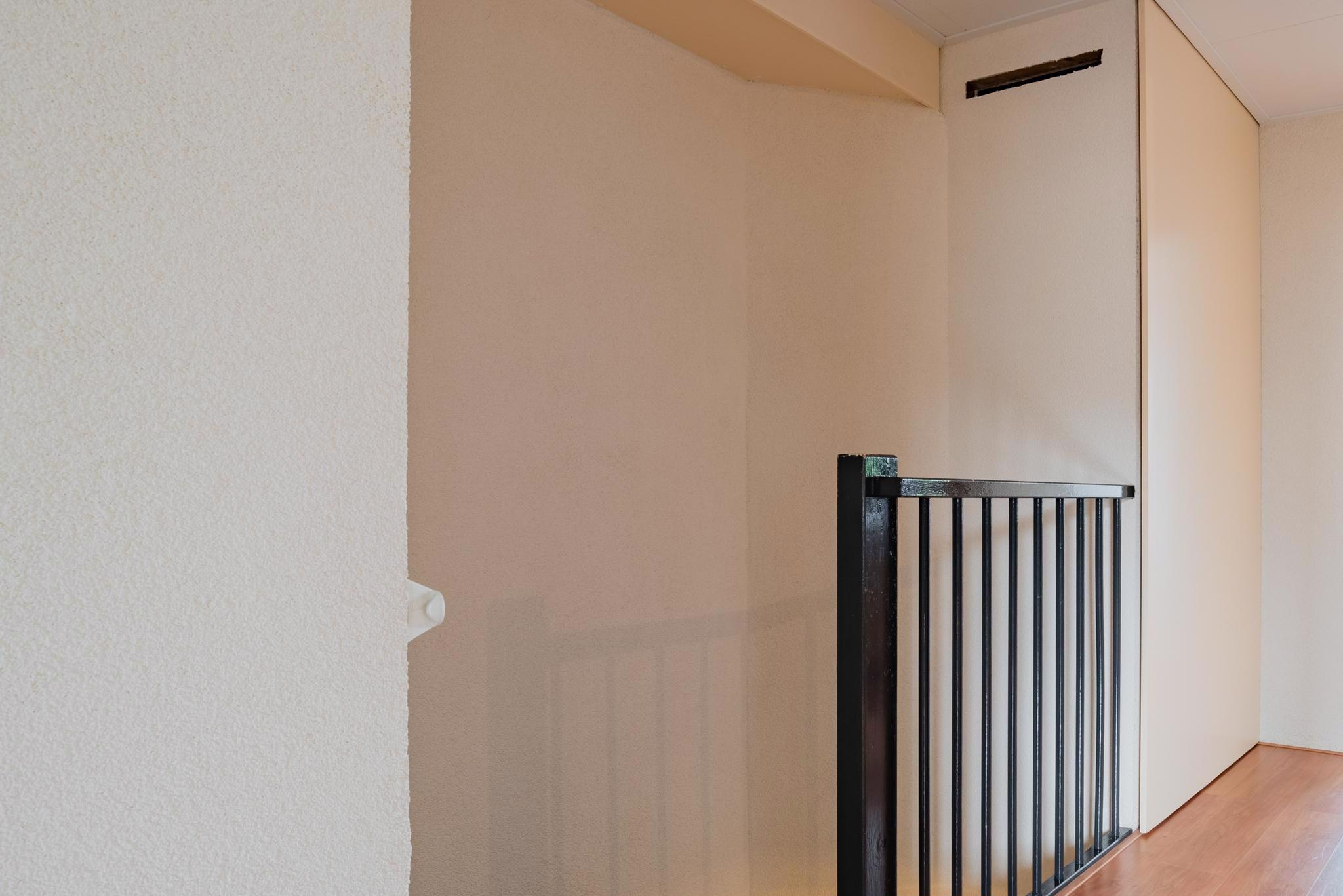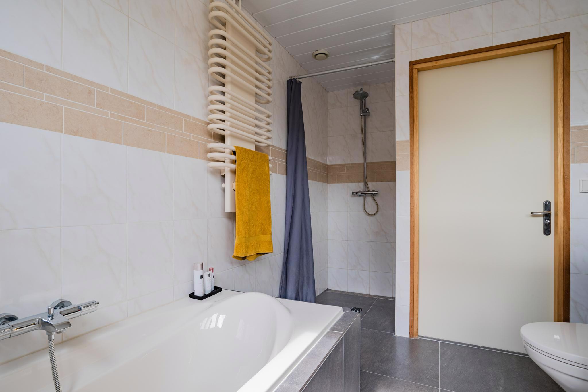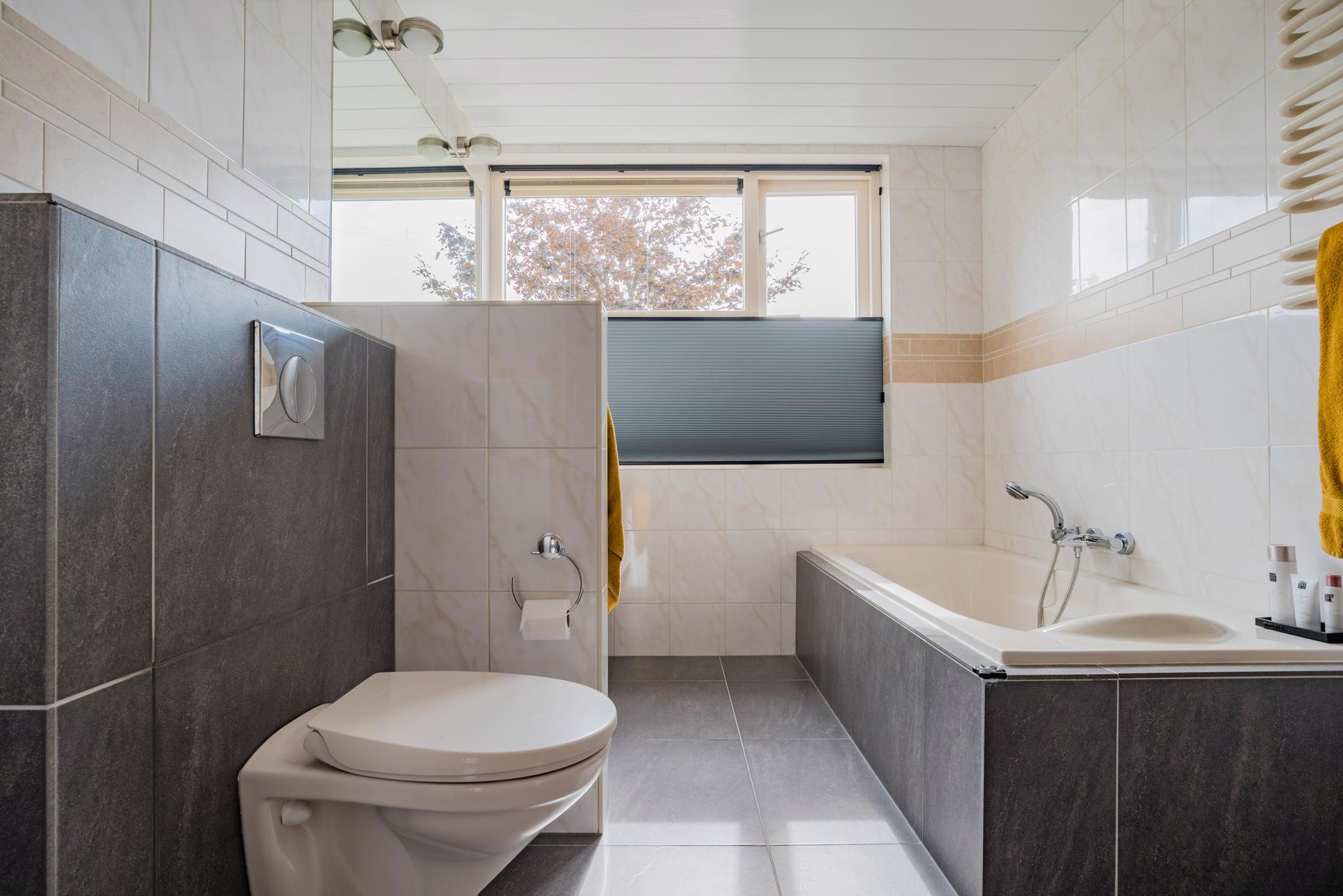 Via de deur in de woonkamer kom je bij trapopgang. Hier is ook het nette toilet te vinden. De eerste verdieping heeft 3 slaapkamers, een grote kledingkamer en een ruime badkamer. De badkamer is in 2010 opnieuw gedaan en tot bovenaan betegeld. Hier vind je een badmeubel met wastafel, toilet, bad en een douche. Op de overloop is plek voor de cv-ketel en wasmachine. Deze zijn netjes weggewerkt achter de schuifdeuren. De vliering is bereikbaar via de vlizotrap in de slaapkamer aan de voorkant van het huis.