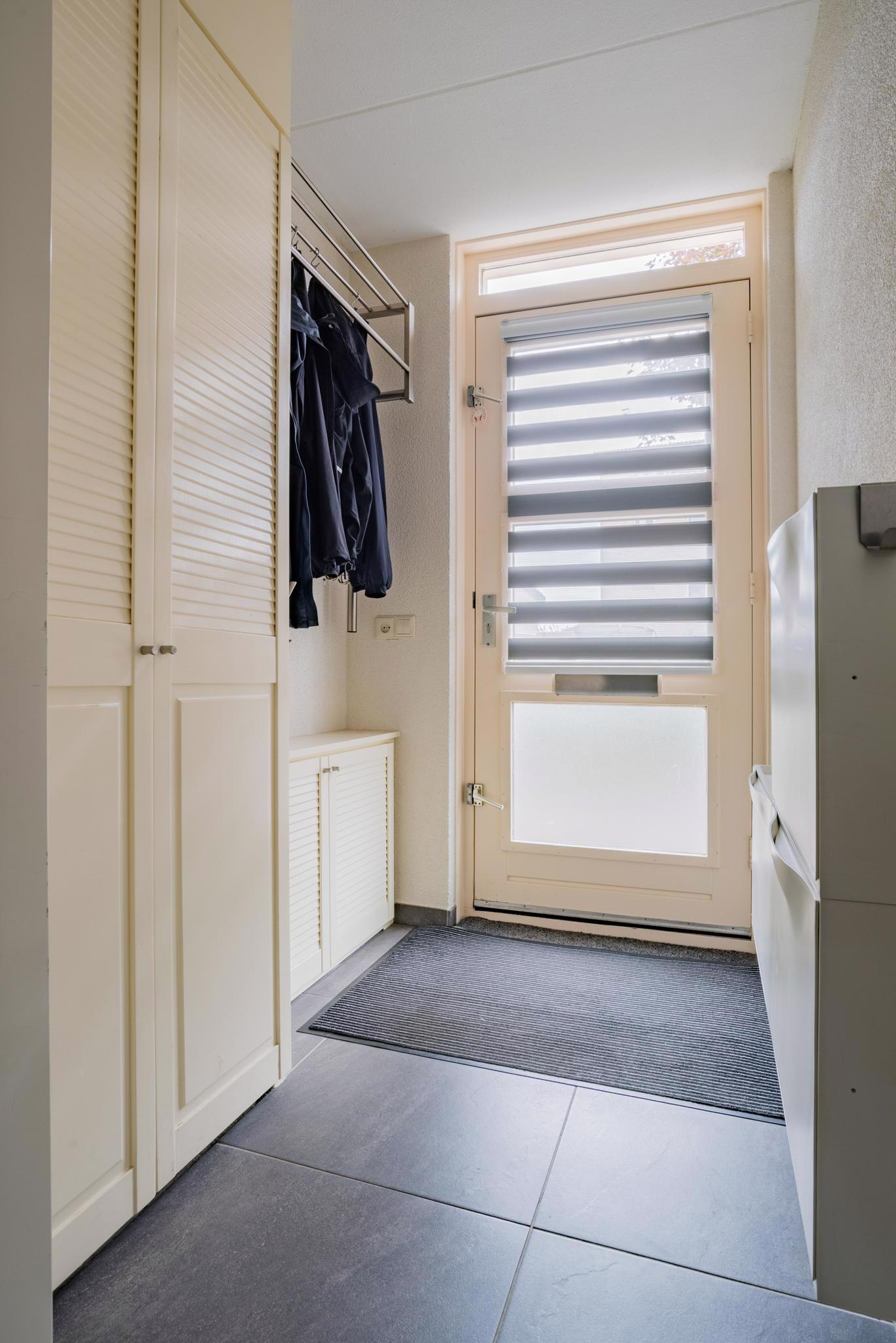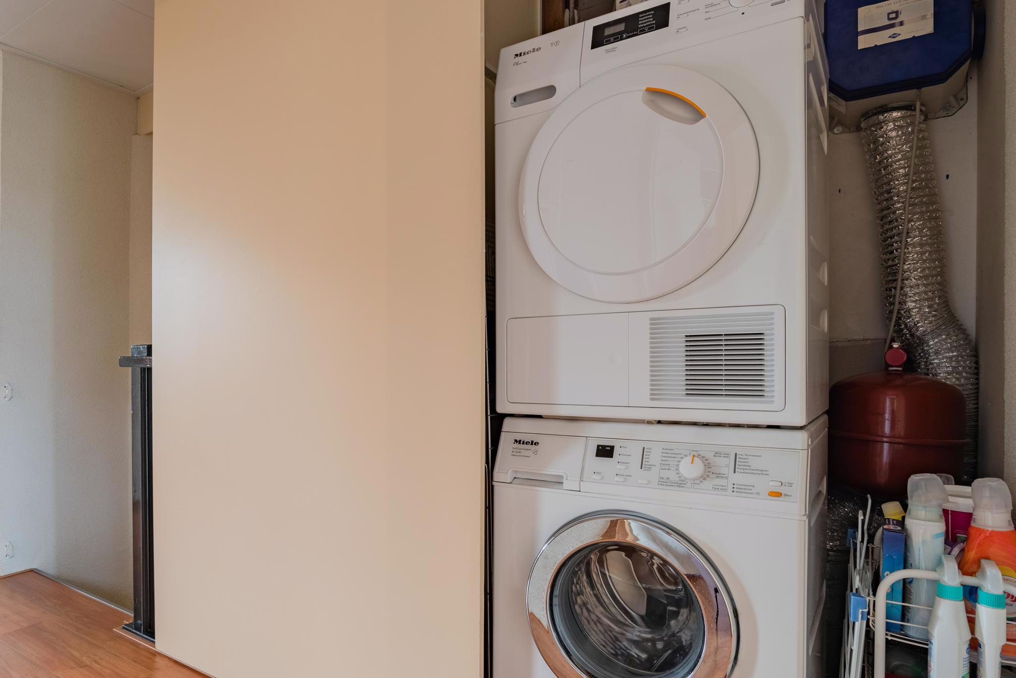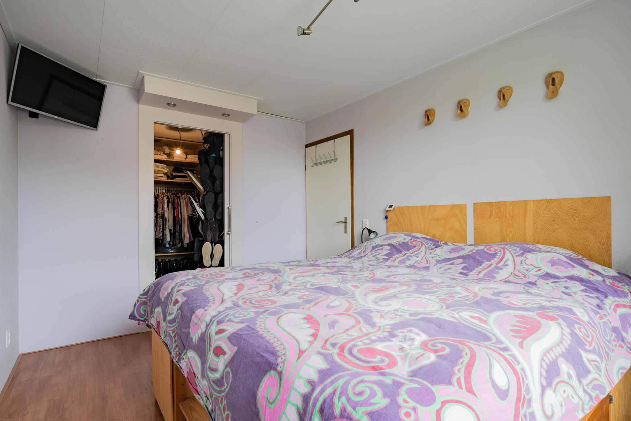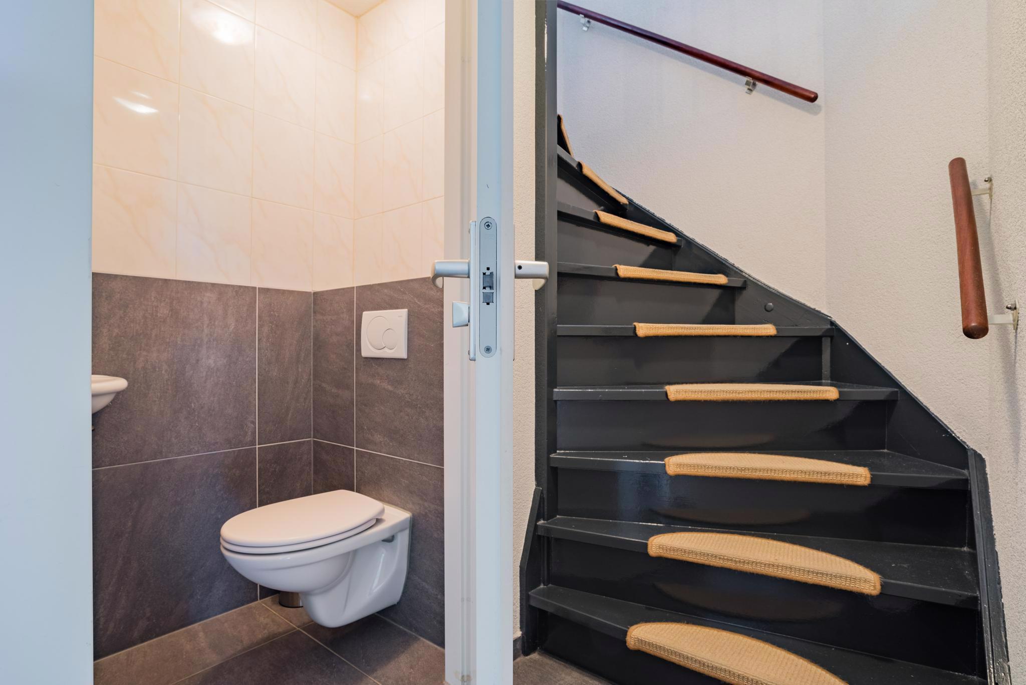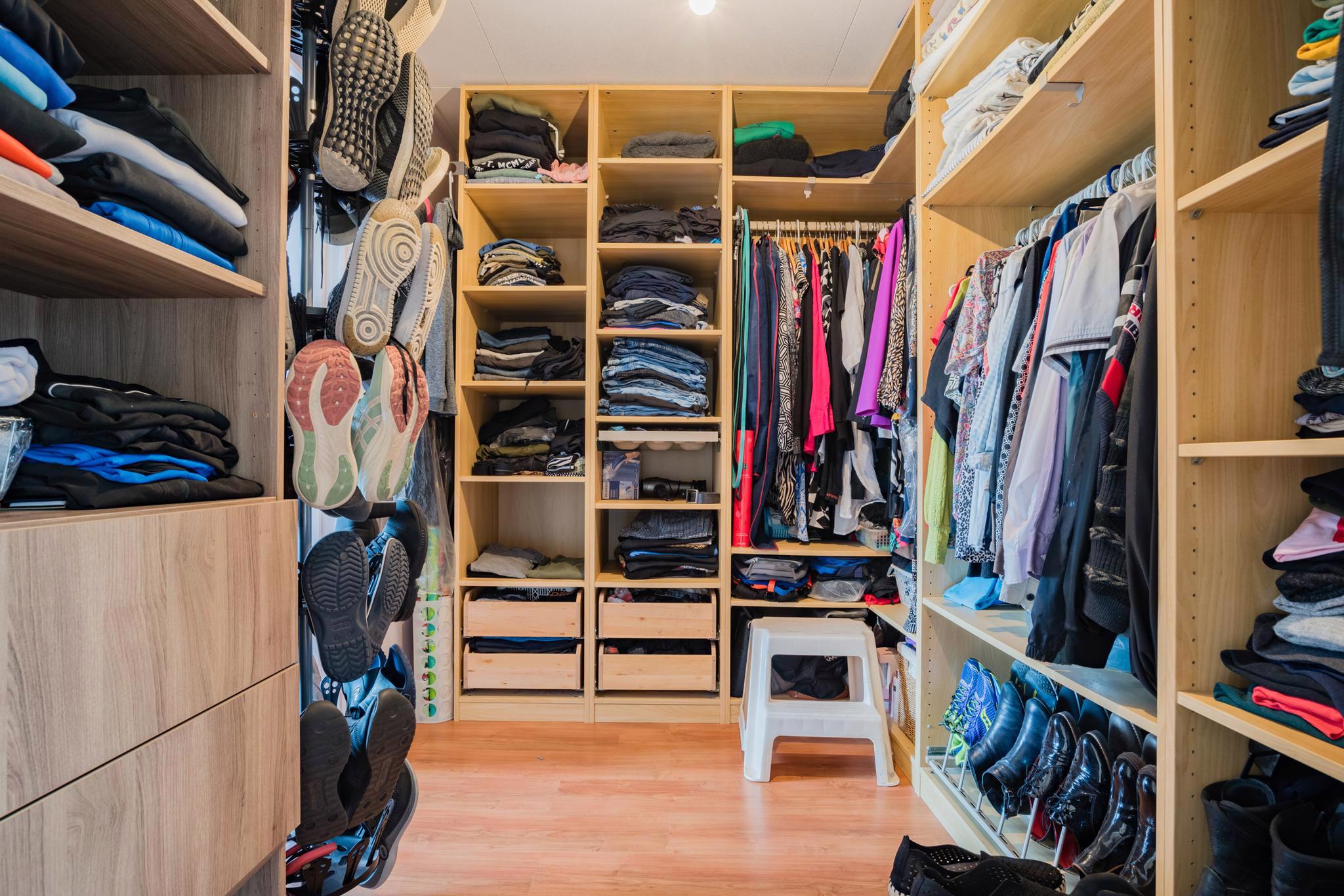 Via de deur in de woonkamer kom je bij trapopgang. Hier is ook het nette toilet te vinden. De eerste verdieping heeft 3 slaapkamers, een grote kledingkamer en een ruime badkamer. De badkamer is in 2010 opnieuw gedaan en tot bovenaan betegeld. Hier vind je een badmeubel met wastafel, toilet, bad en een douche. Op de overloop is plek voor de cv-ketel en wasmachine. Deze zijn netjes weggewerkt achter de schuifdeuren. De vliering is bereikbaar via de vlizotrap in de slaapkamer aan de voorkant van het huis.