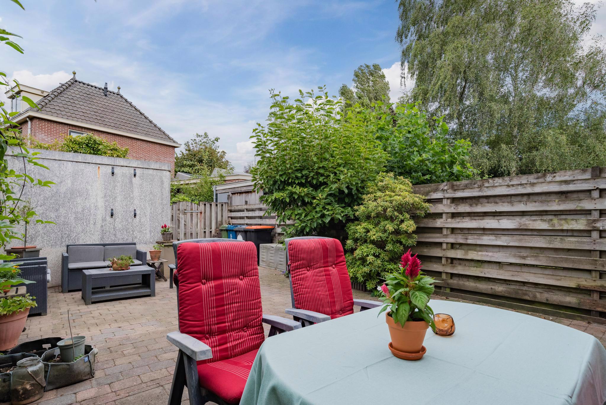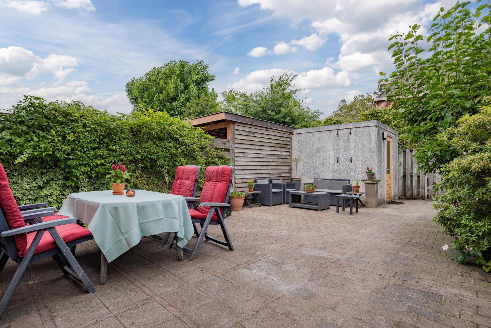 Zowel de voortuin als de achtertuin zijn bestraat en aangelegd met borders. In de achtertuin staat een stenen berging. Ook is er een buitenkraantje aanwezig.