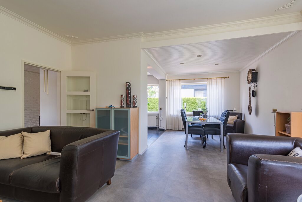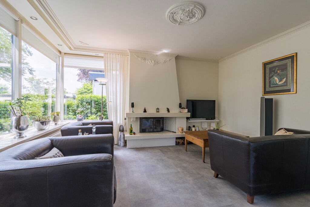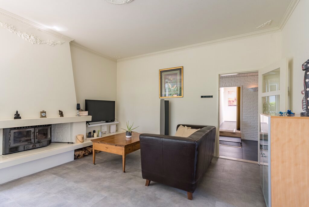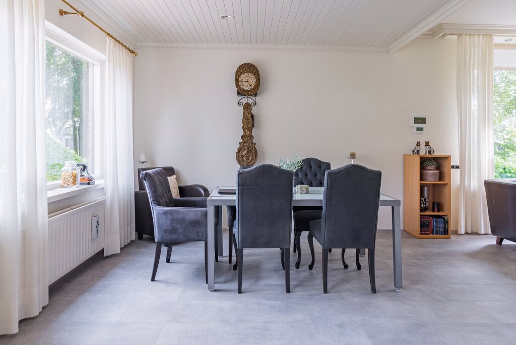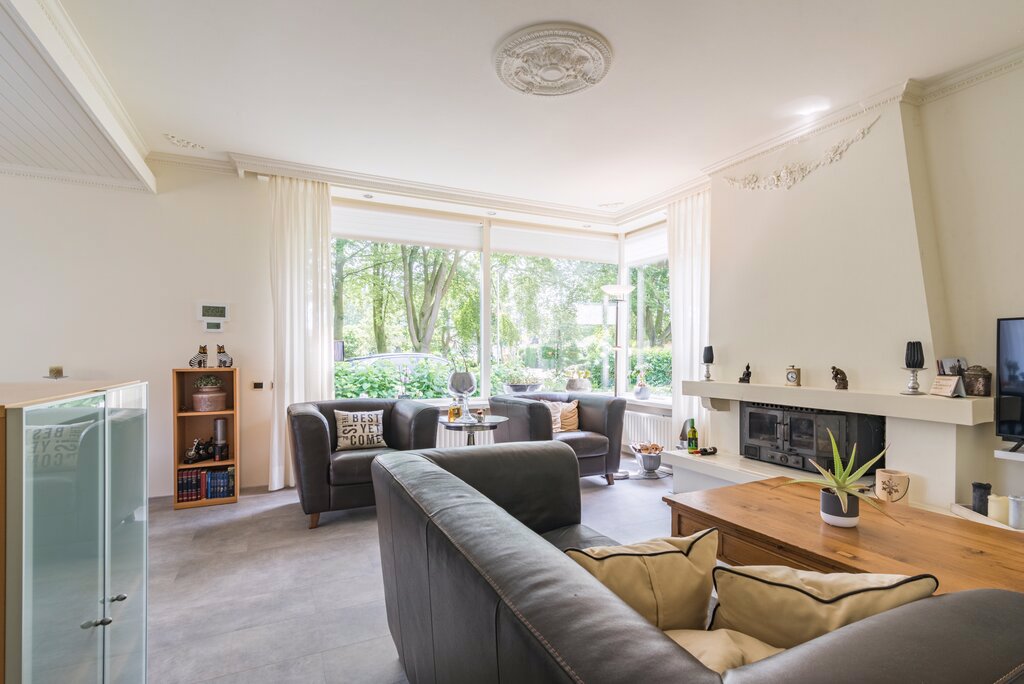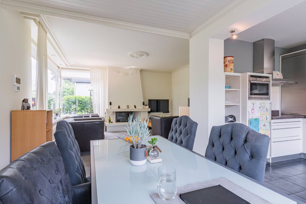 De voortuin ziet er prachtig uit! Samen met de oprit die onlangs opnieuw bestraat is, geeft dit direct een verzorgde indruk. Via de voordeur en de hal komen we in de woonkamer. Door de grote raampartijen komt veel licht naar binnen en geniet je van het uitzicht met grasveld en bomen. In 2018 is er een nieuwe pvc-vloer gelegd. ’s Winters zit je hier heerlijk voor de open haard. De hoekkeuken heeft de beschikking over onder andere een inductiekookplaat, afzuigkap, koelkast, magnetron, afwasmachine en een natuurstenen aanrechtblad.