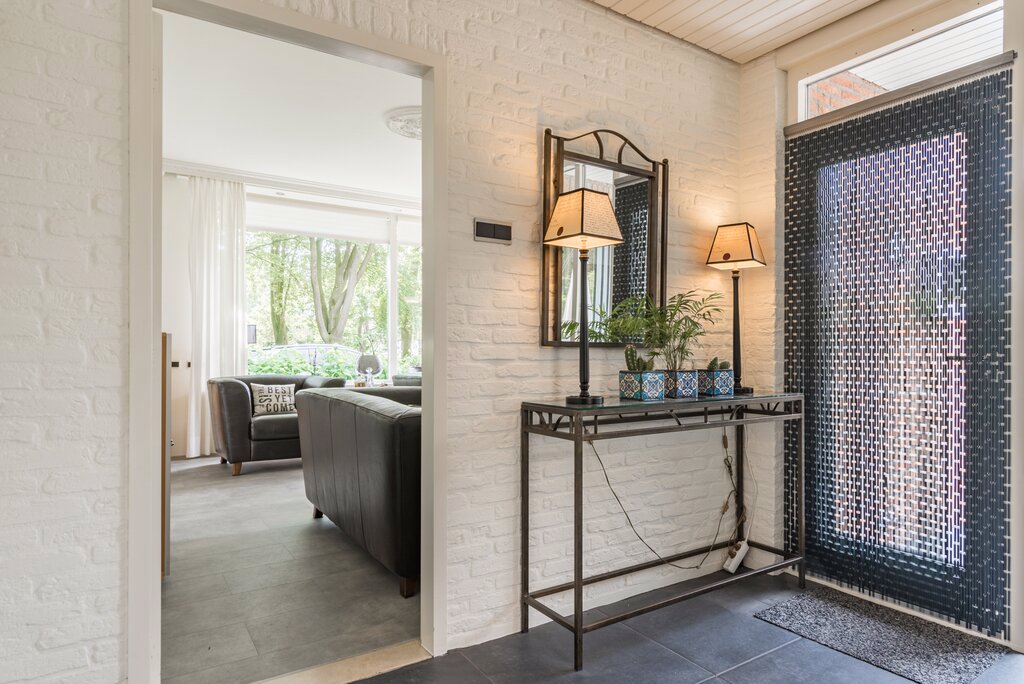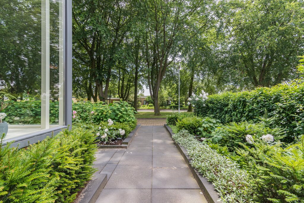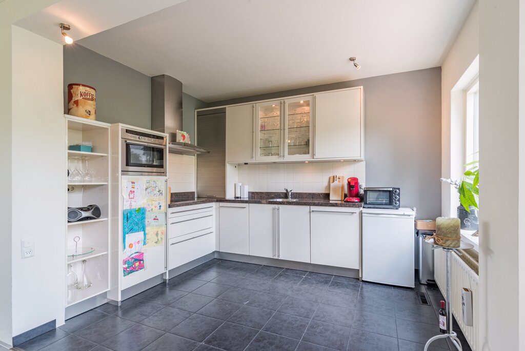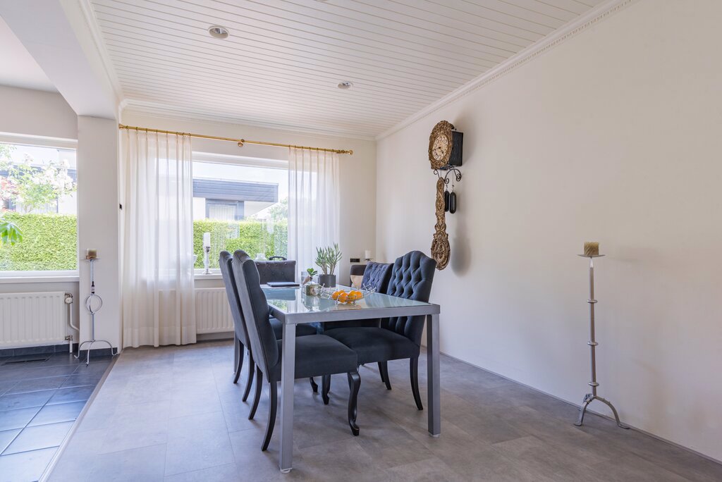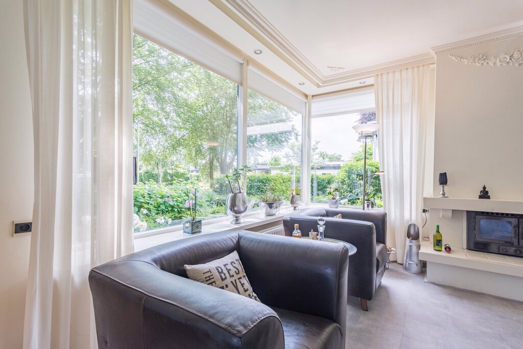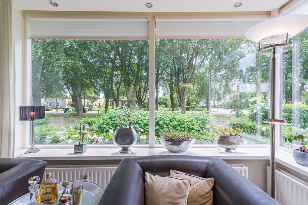De voortuin ziet er prachtig uit! Samen met de oprit die onlangs opnieuw bestraat is, geeft dit direct een verzorgde indruk. Via de voordeur en de hal komen we in de woonkamer. Door de grote raampartijen komt veel licht naar binnen en geniet je van het uitzicht met grasveld en bomen. In 2018 is er een nieuwe pvc-vloer gelegd. ’s Winters zit je hier heerlijk voor de open haard. De hoekkeuken heeft de beschikking over onder andere een inductiekookplaat, afzuigkap, koelkast, magnetron, afwasmachine en een natuurstenen aanrechtblad.