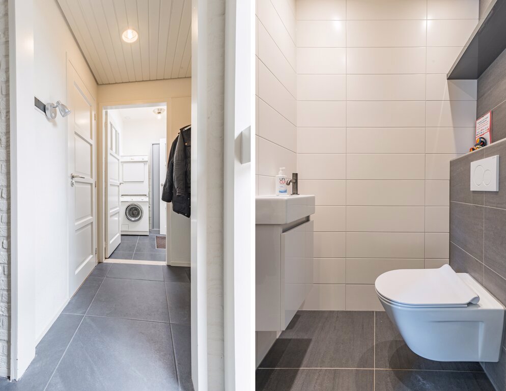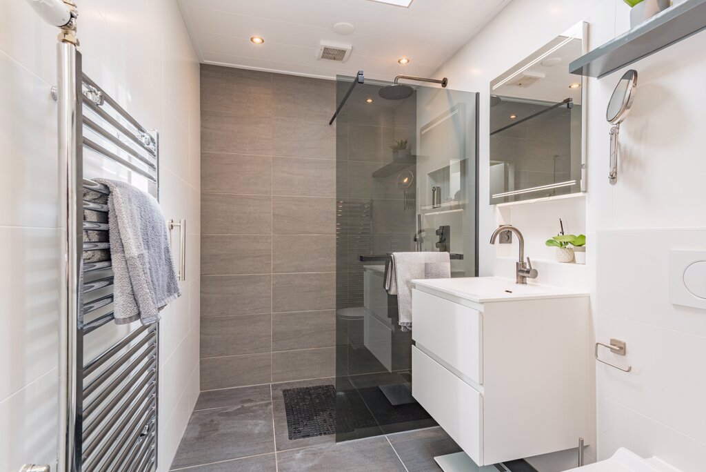 Vanuit de hal kom je via een kleine verhoging of met de aanwezige lift, in het slaapgedeelte. Hier is een badkamer te vinden die in 2018 geheel is vernieuwd met een ruime inloopdouche, toilet, designradiator en wastafelmeubel. Er zijn 2 royale slaapkamers aanwezig, waarvan er momenteel één is ingericht als kantoorruimte.