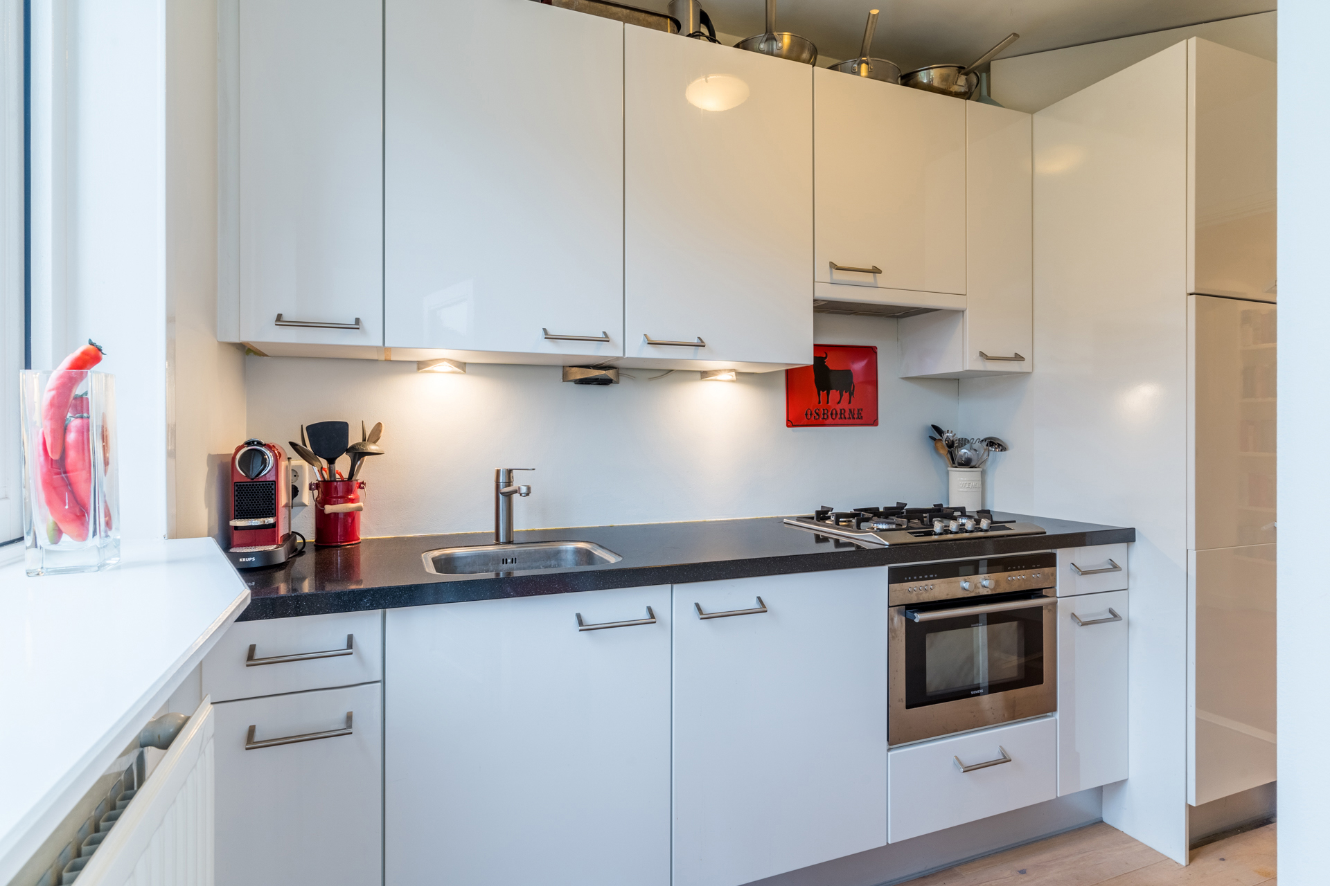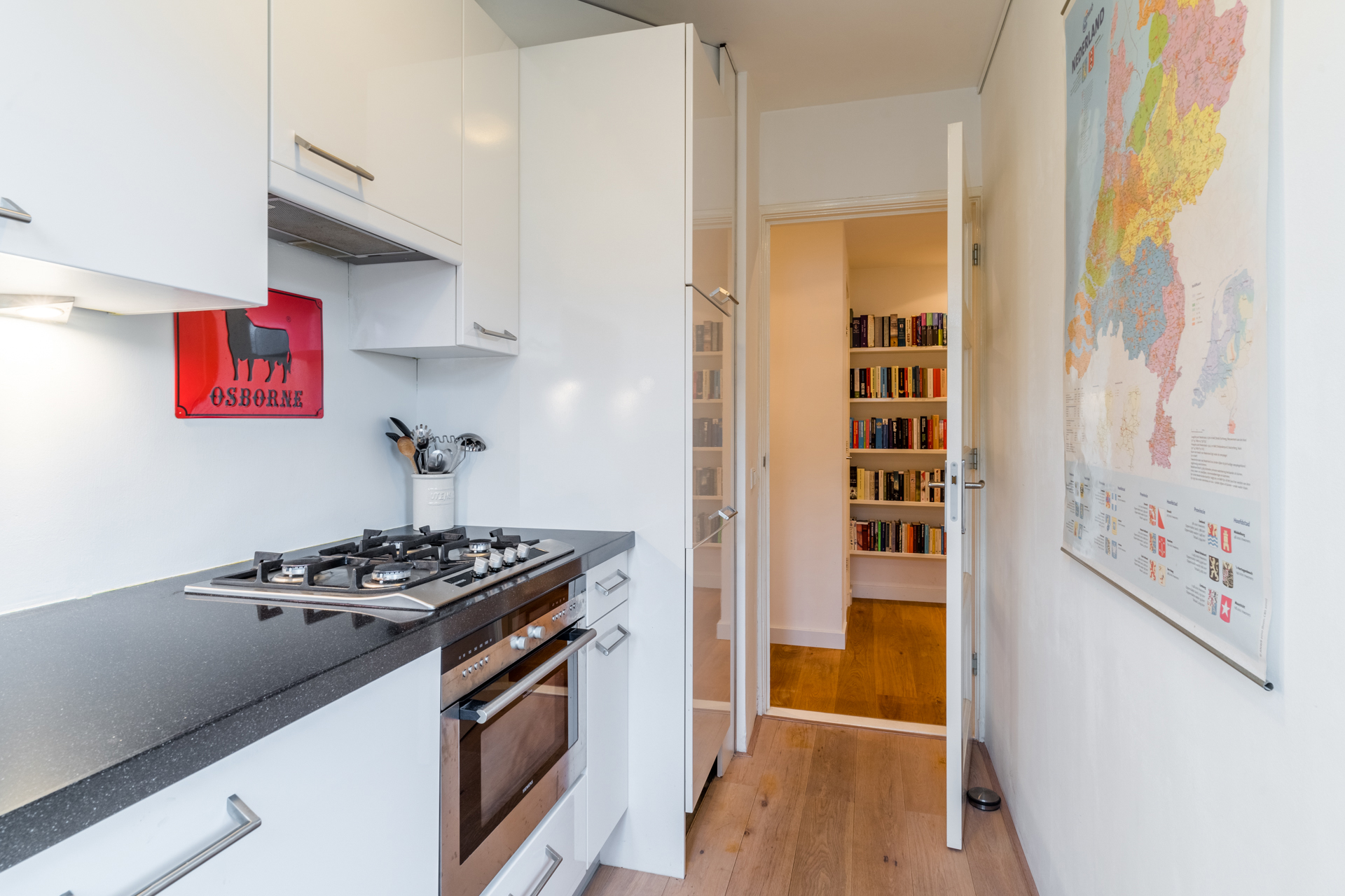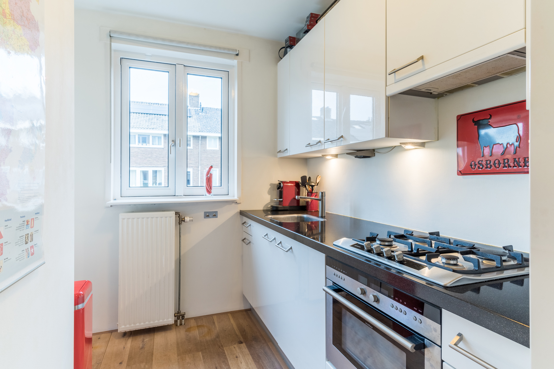 In de keuken en slaapkamer ligt lamelparket op de vloer. Vanuit deze beide ruimtes is het 2e balkon aan de achterzijde bereikbaar. Dit balkon ligt op het oosten. De slaapkamer heeft praktische kasten en een inbouwkast. De keuken is voorzien van een 4-pits gasfornuis, een afzuigkap, koelkast en oven. De wasmachine en cv-ketel zijn netjes uit het zicht geplaatst in de hoge keukenkast.
