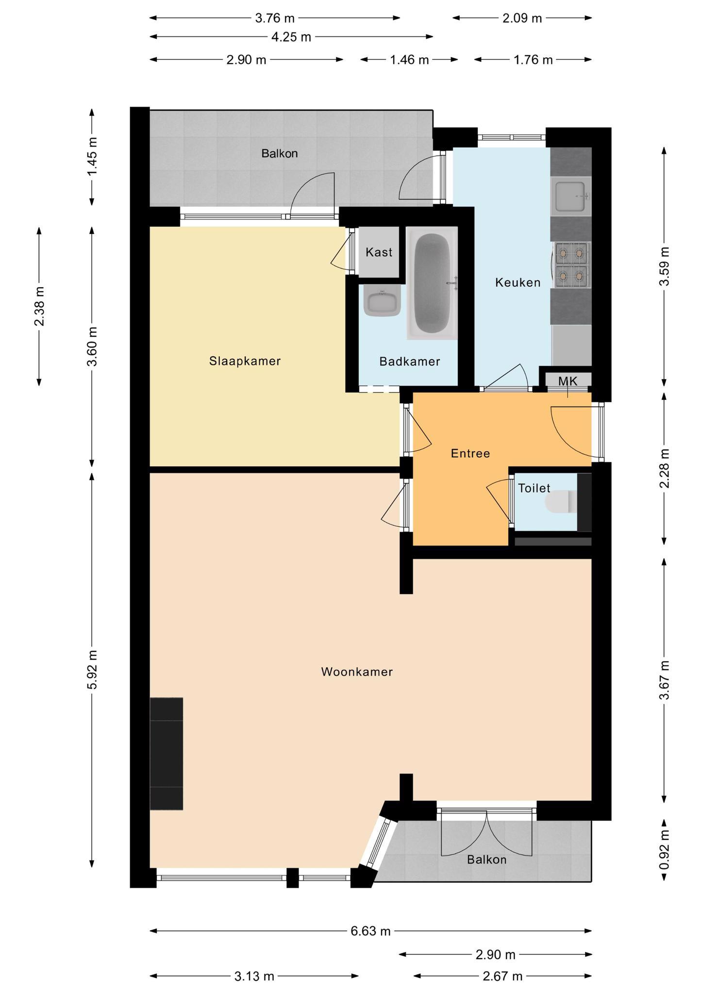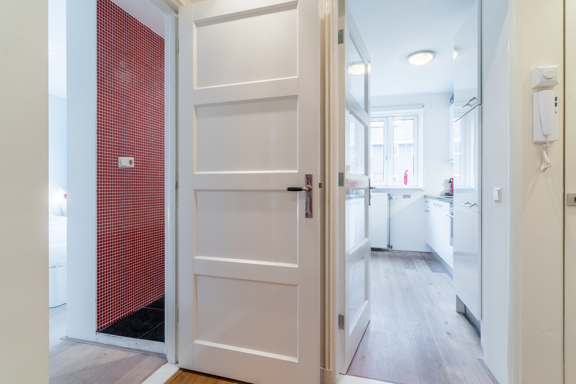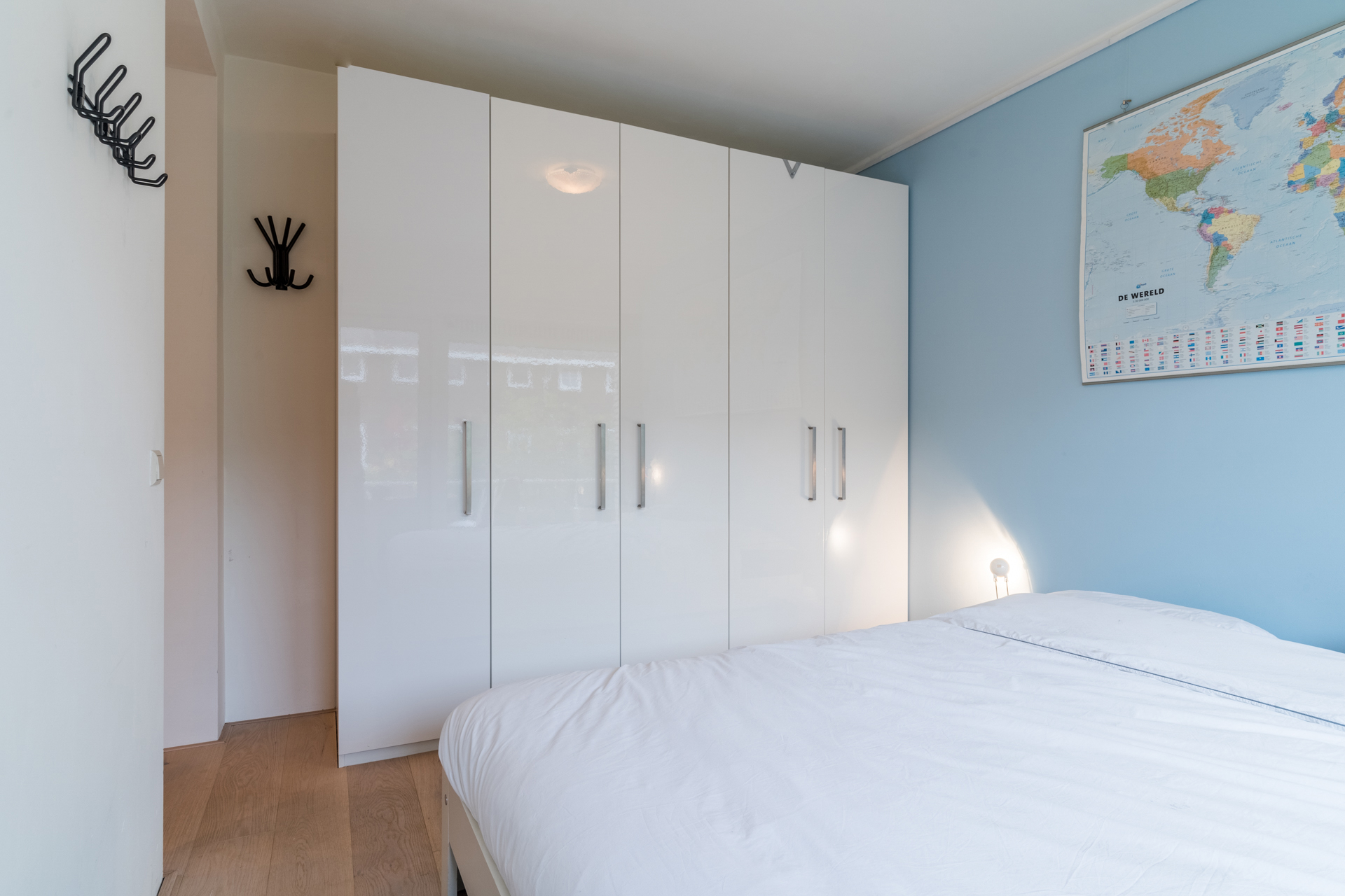 In de keuken en slaapkamer ligt lamelparket op de vloer. Vanuit deze beide ruimtes is het 2e balkon aan de achterzijde bereikbaar. Dit balkon ligt op het oosten. De slaapkamer heeft praktische kasten en een inbouwkast. De keuken is voorzien van een 4-pits gasfornuis, een afzuigkap, koelkast en oven. De wasmachine en cv-ketel zijn netjes uit het zicht geplaatst in de hoge keukenkast.
