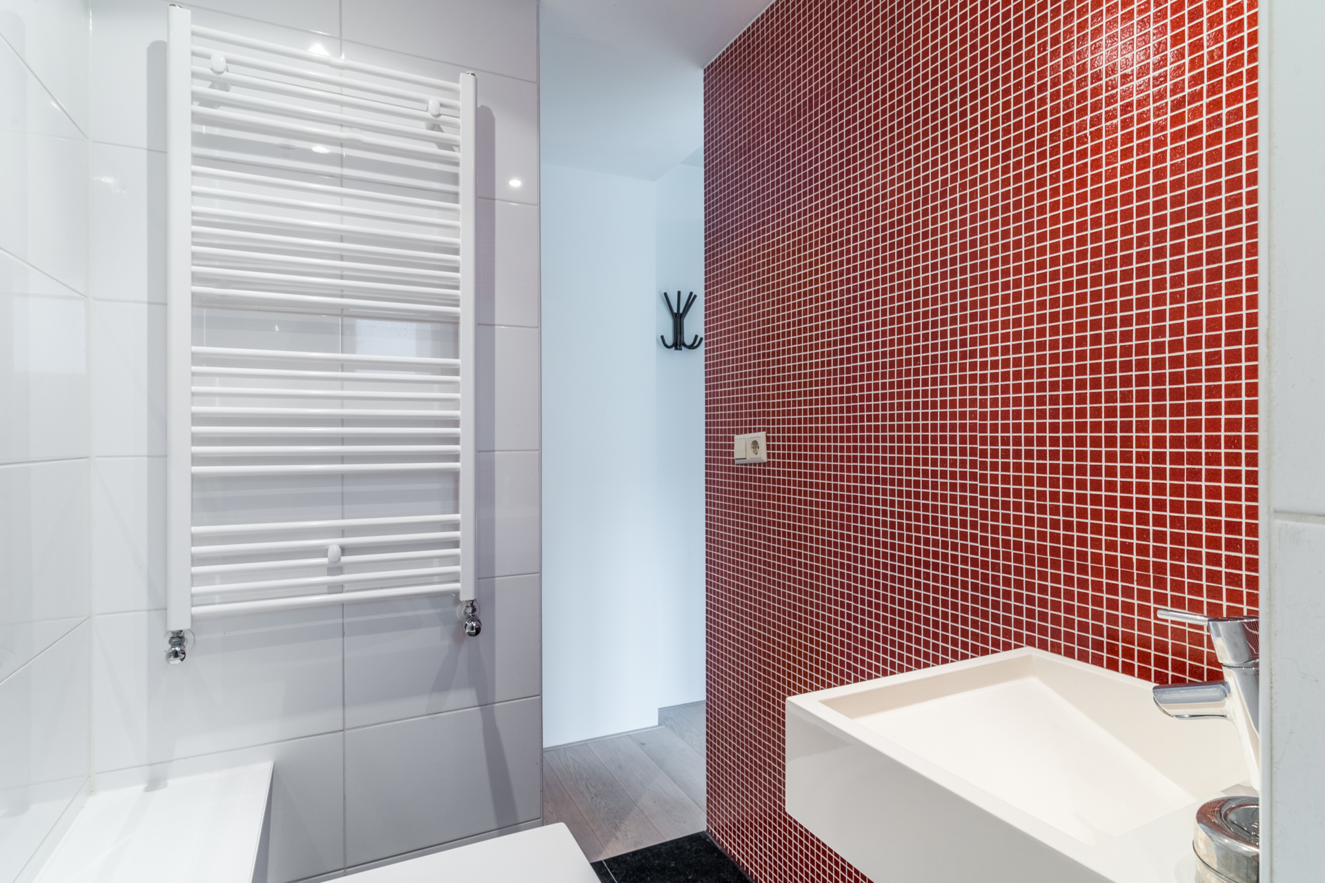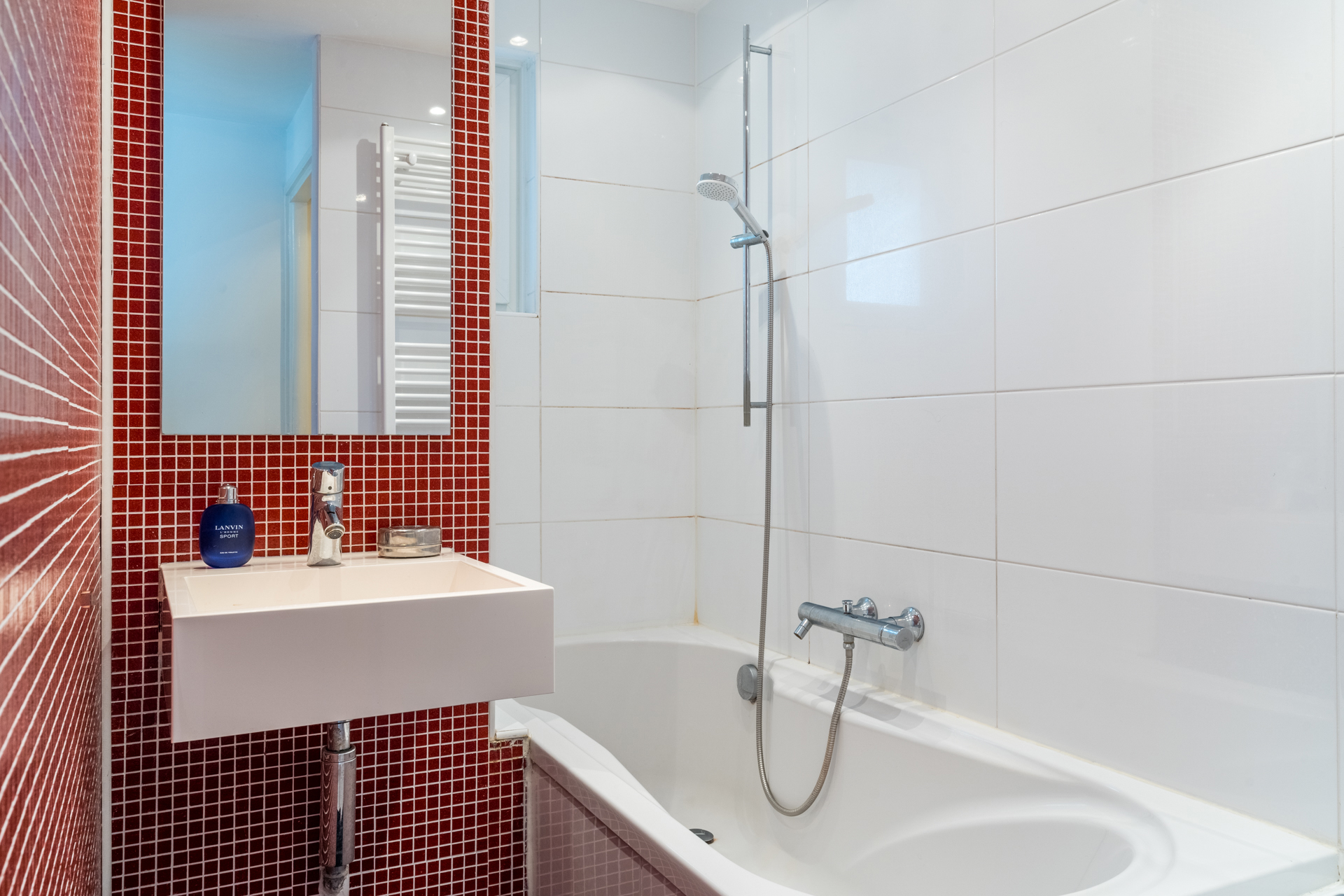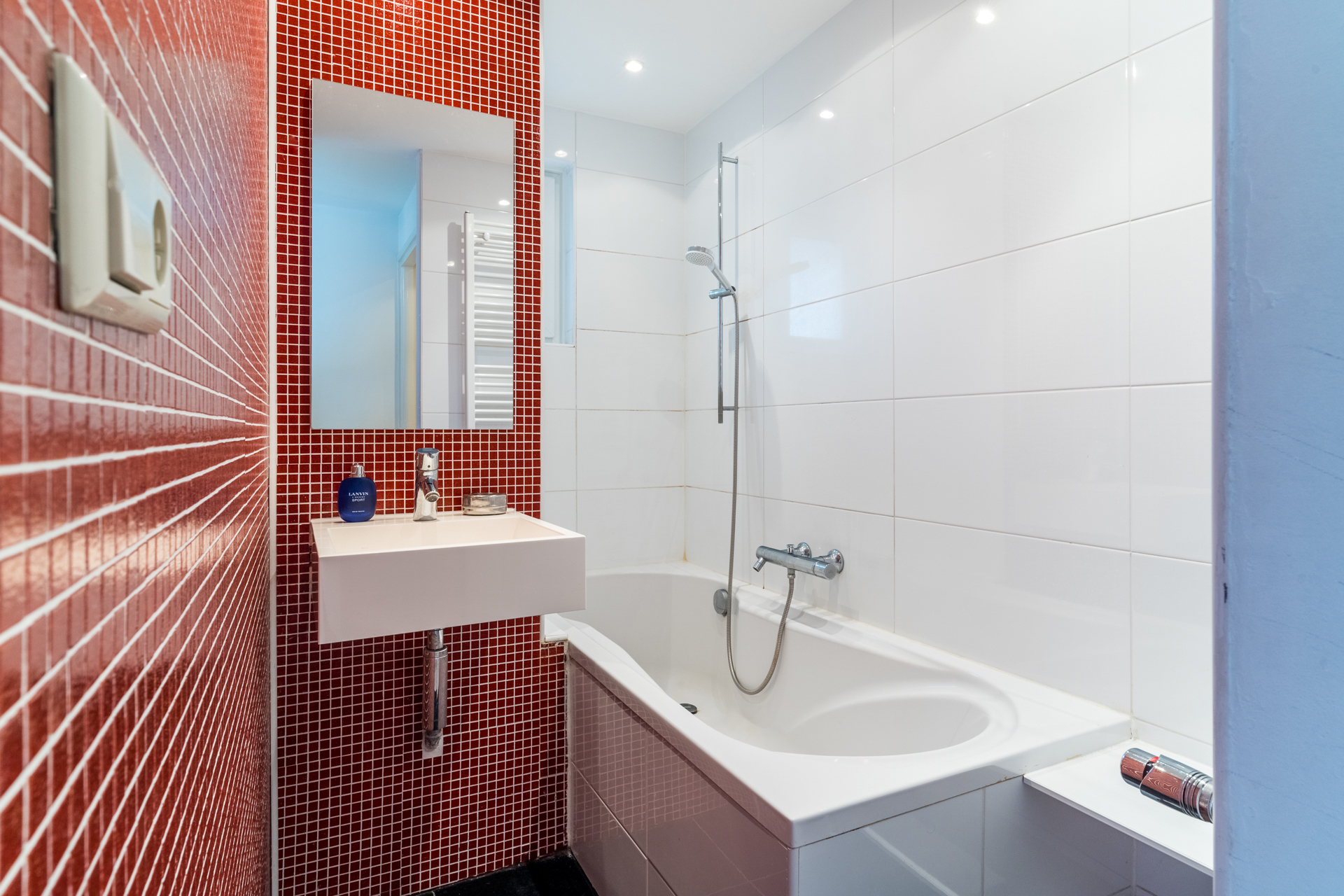 De nette badkamer beschikt over een ligbad en badmeubel. Er is een apart toilet aanwezig in de hal.
