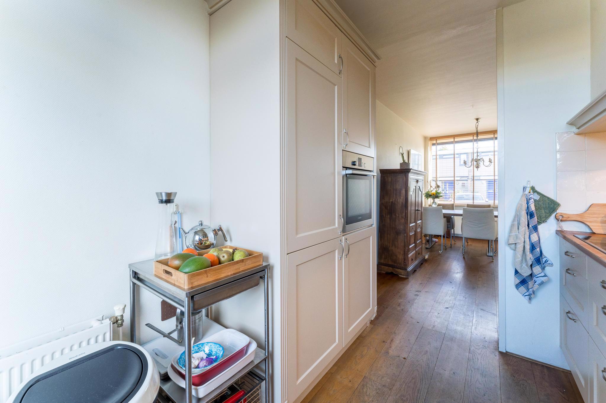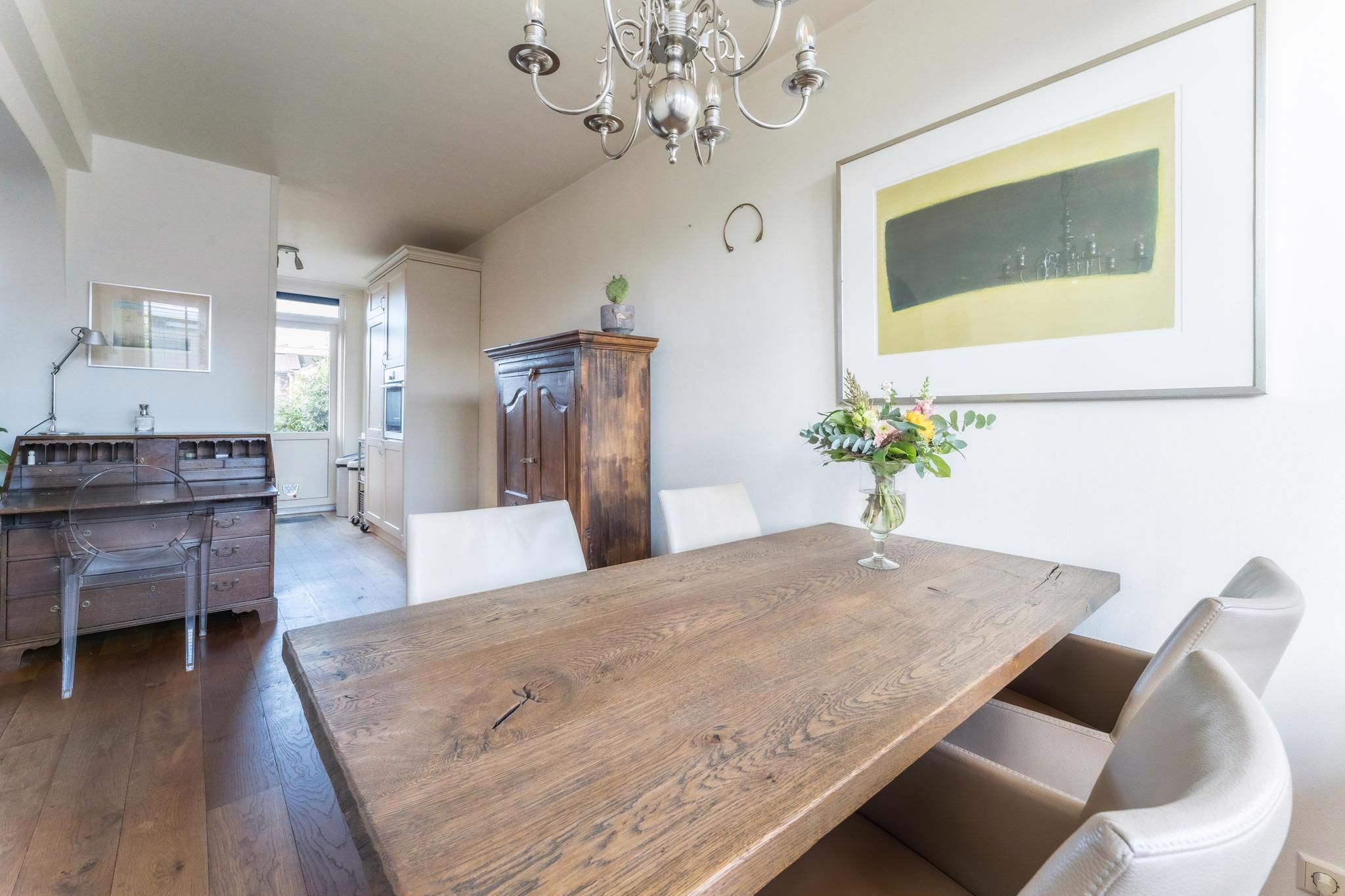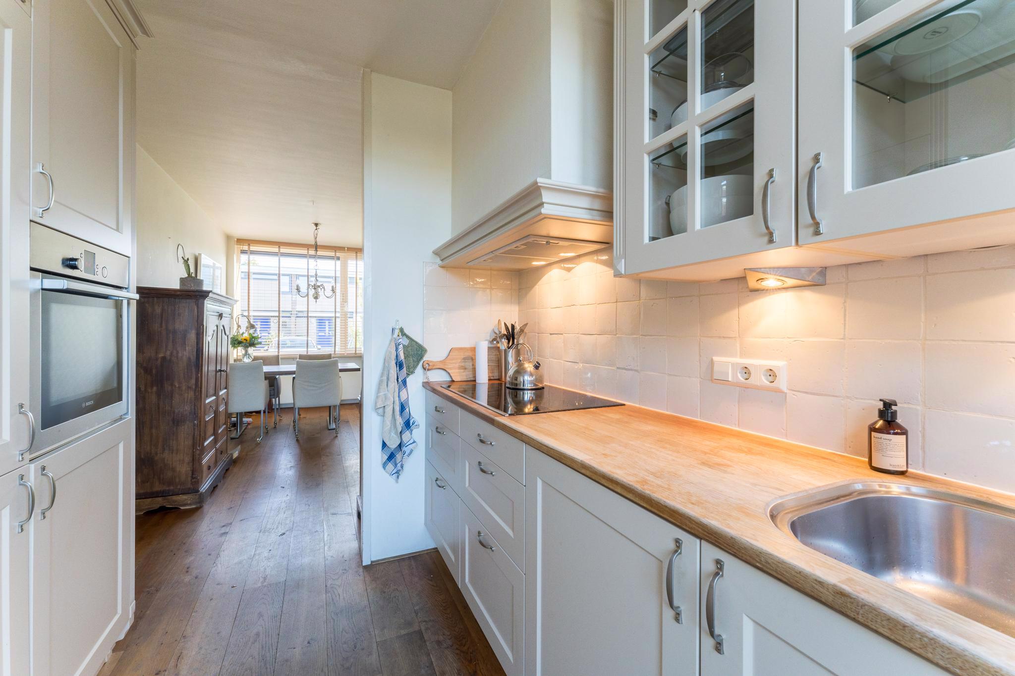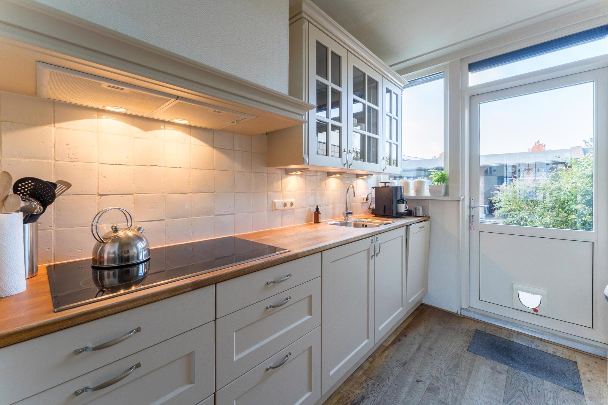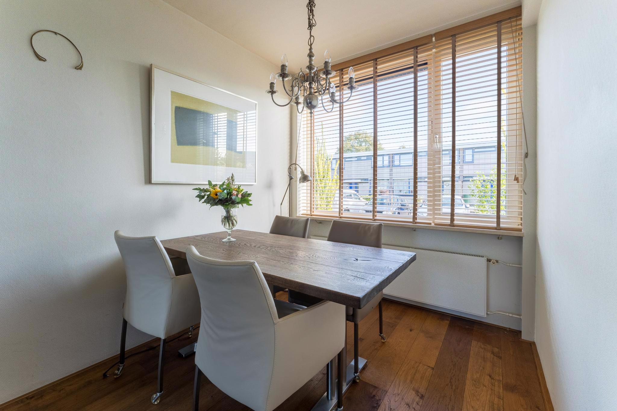 Vanuit de lichte zitkamer kijk je uit op de achtertuin. Aan de voorzijde van de woning is het eetgedeelte. Er is een praktische trapkast aanwezig. De keuken, vernieuwd in 2008, is volledig uitgerust met moderne inbouwapparatuur zoals een inductiekookplaat, oven, koelkast, vriezer, afzuigkap en vaatwasser.