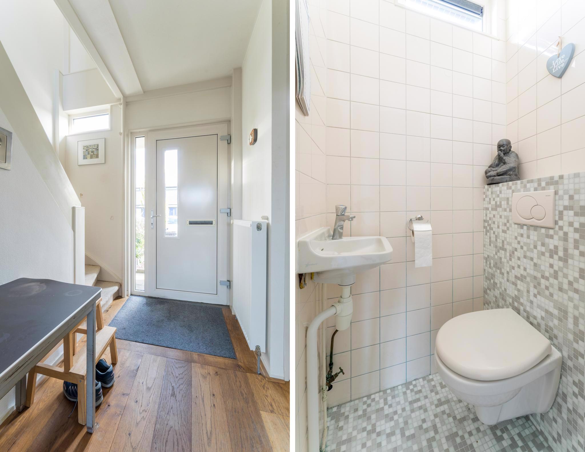 In de hal vind je de trap naar boven, het toilet (2008) en de meterkast. Op de begane grond ligt een fraaie eikenhouten vloer. Desgewenst kan deze opnieuw geschuurd worden en van een andere kleur voorzien worden.