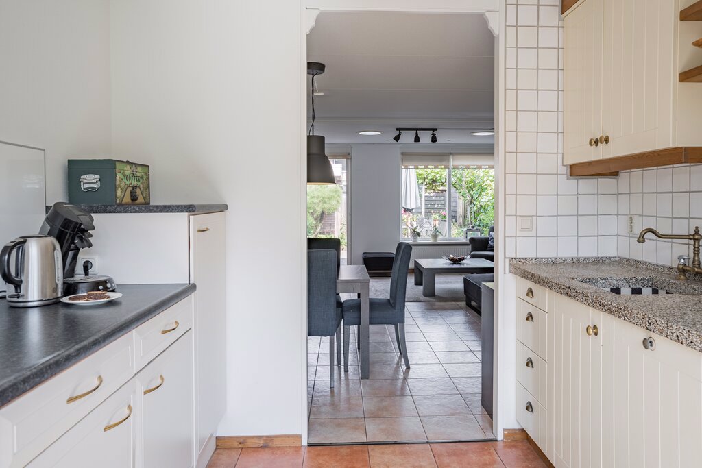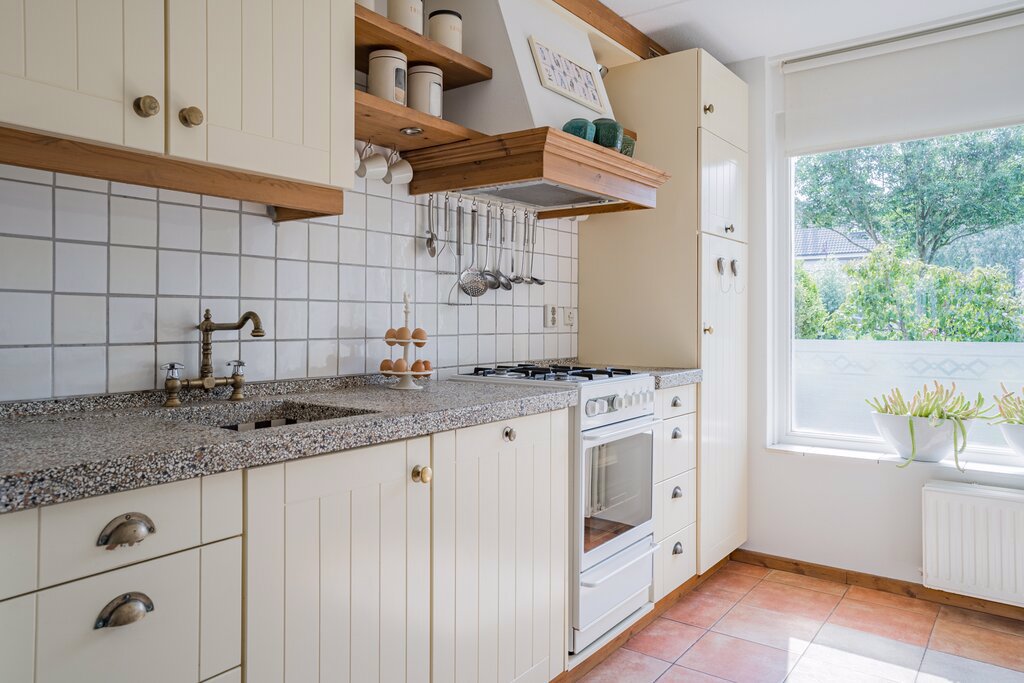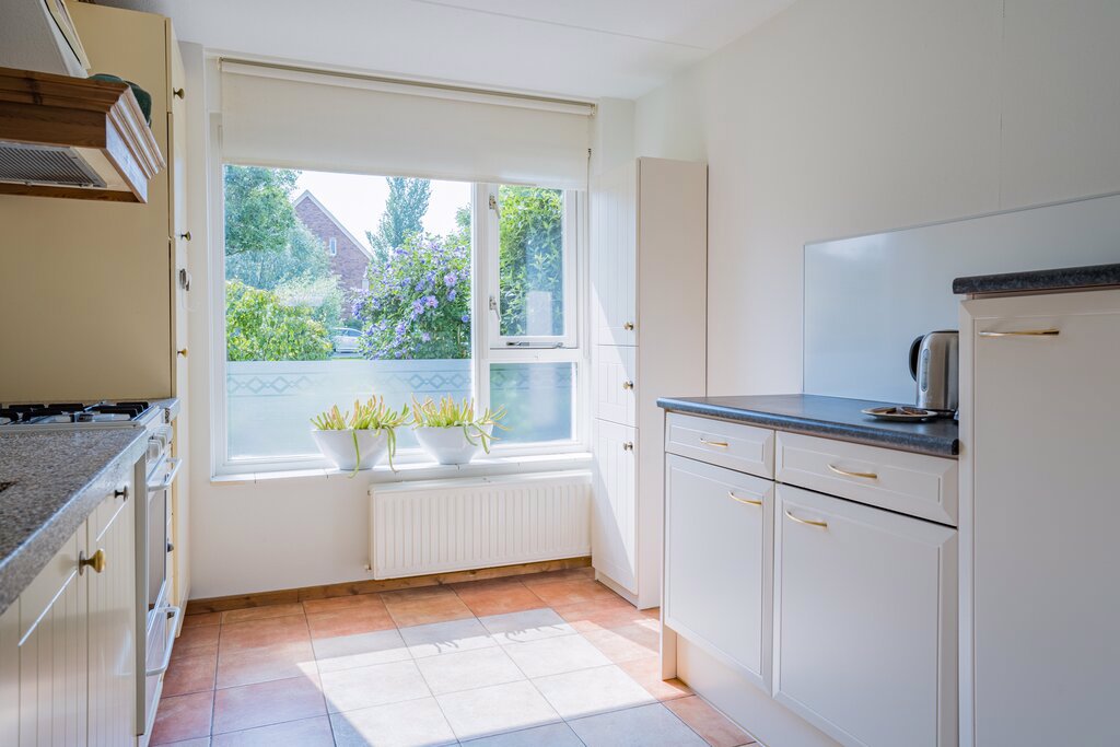 De keuken ligt aan de voorzijde van de woning en is voorzien van een 4-pits gasfornuis met oven, afzuigkap, vaatwasser, koelkast en een stenen aanrechtblad.