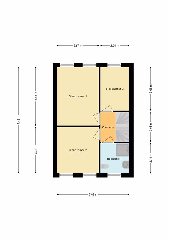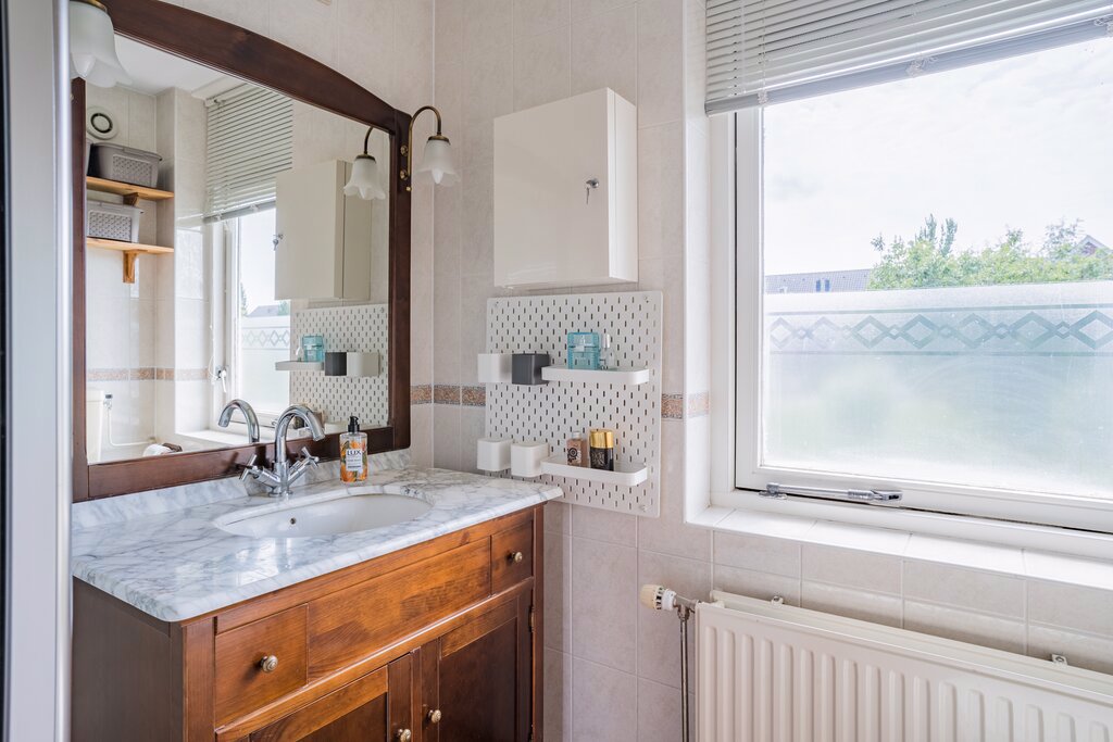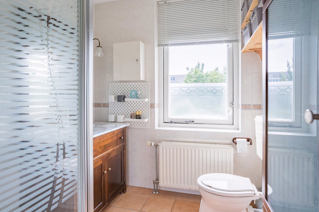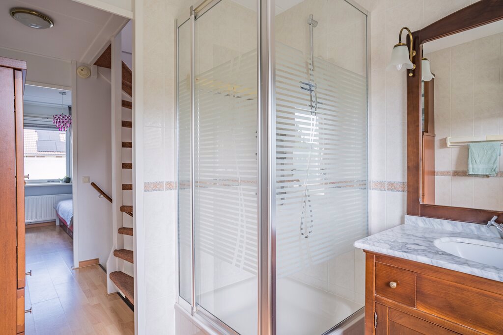 De eerste verdieping heeft 3 royale slaapkamers met vaste kasten. De badkamer is voorzien van een douche, toilet en een houten wastafelmeubel met marmeren blad.