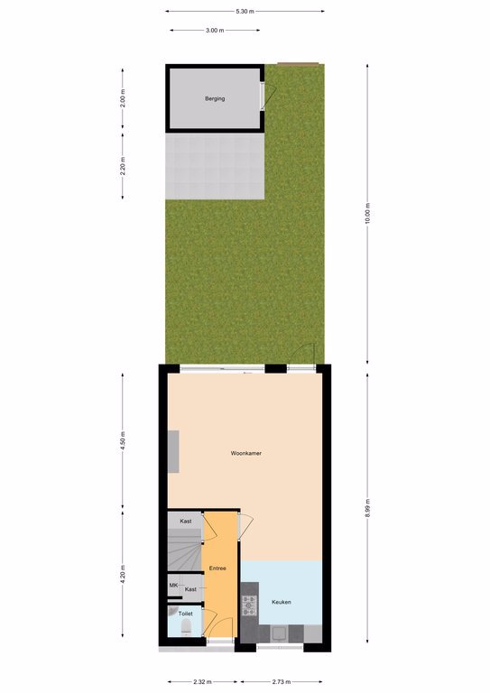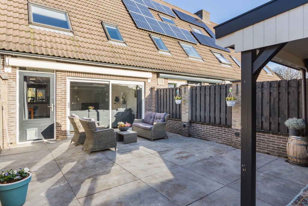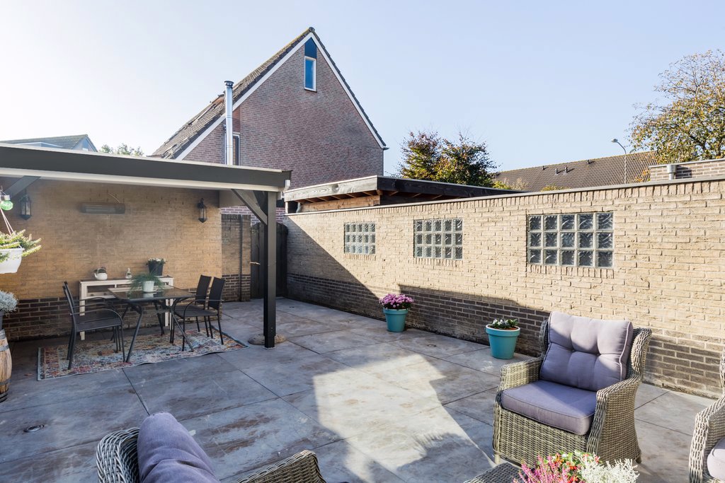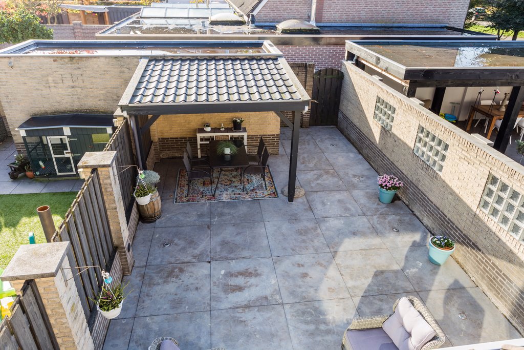De tuin ligt op het zuidwesten; hier kun je de hele dag genieten van de zon. Achterin de tuin staat een stenen berging met een heerlijke overkapping. In de grote voortuin is een deel bestraat, zodat het mogelijk is om een auto op eigen terrein te parkeren. Er is daarnaast veel openbare parkeergelegenheid in de directe omgeving.