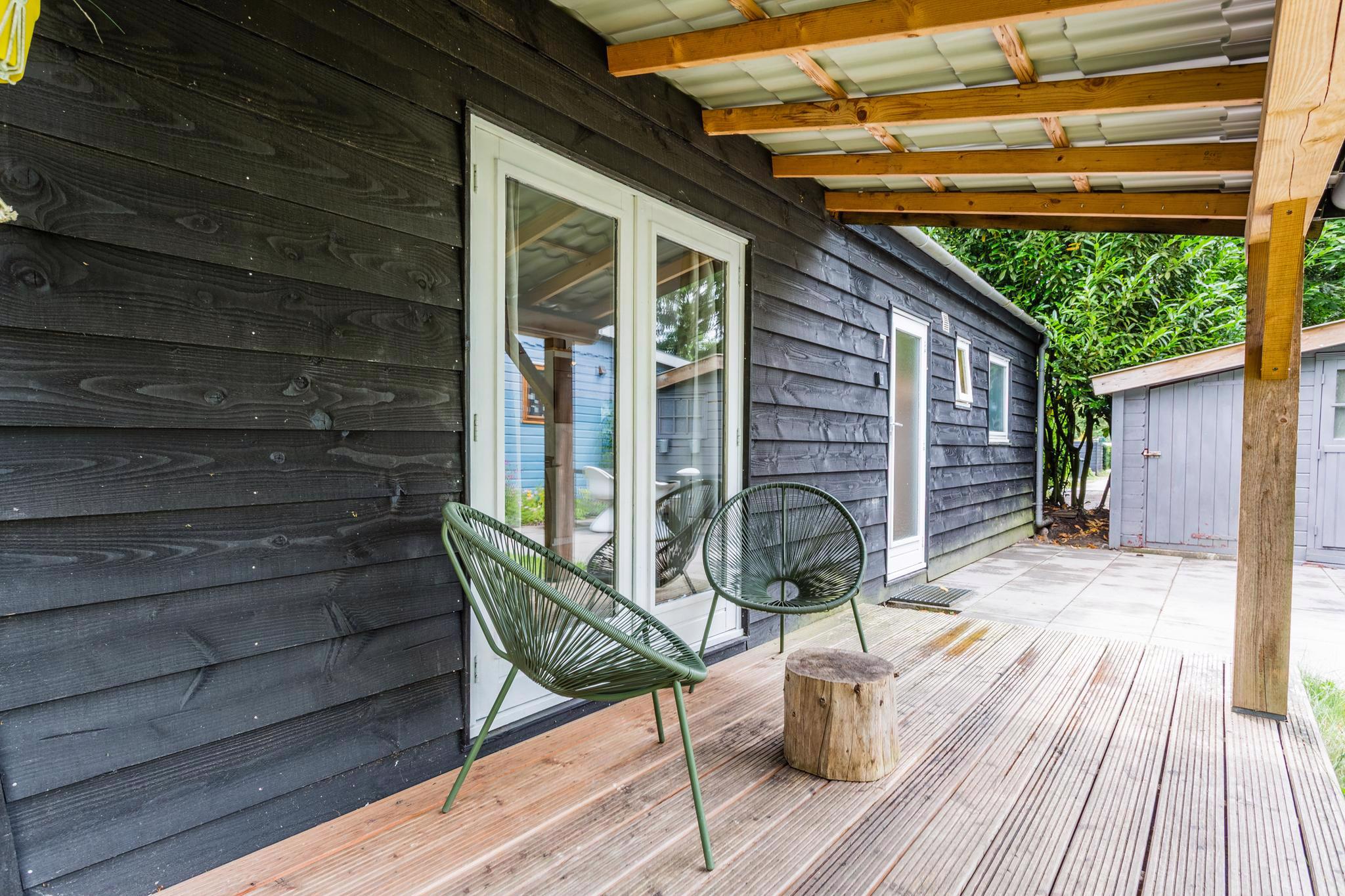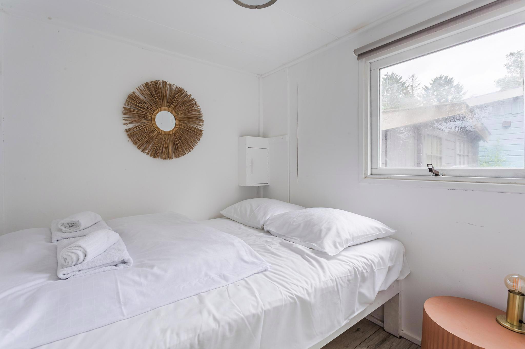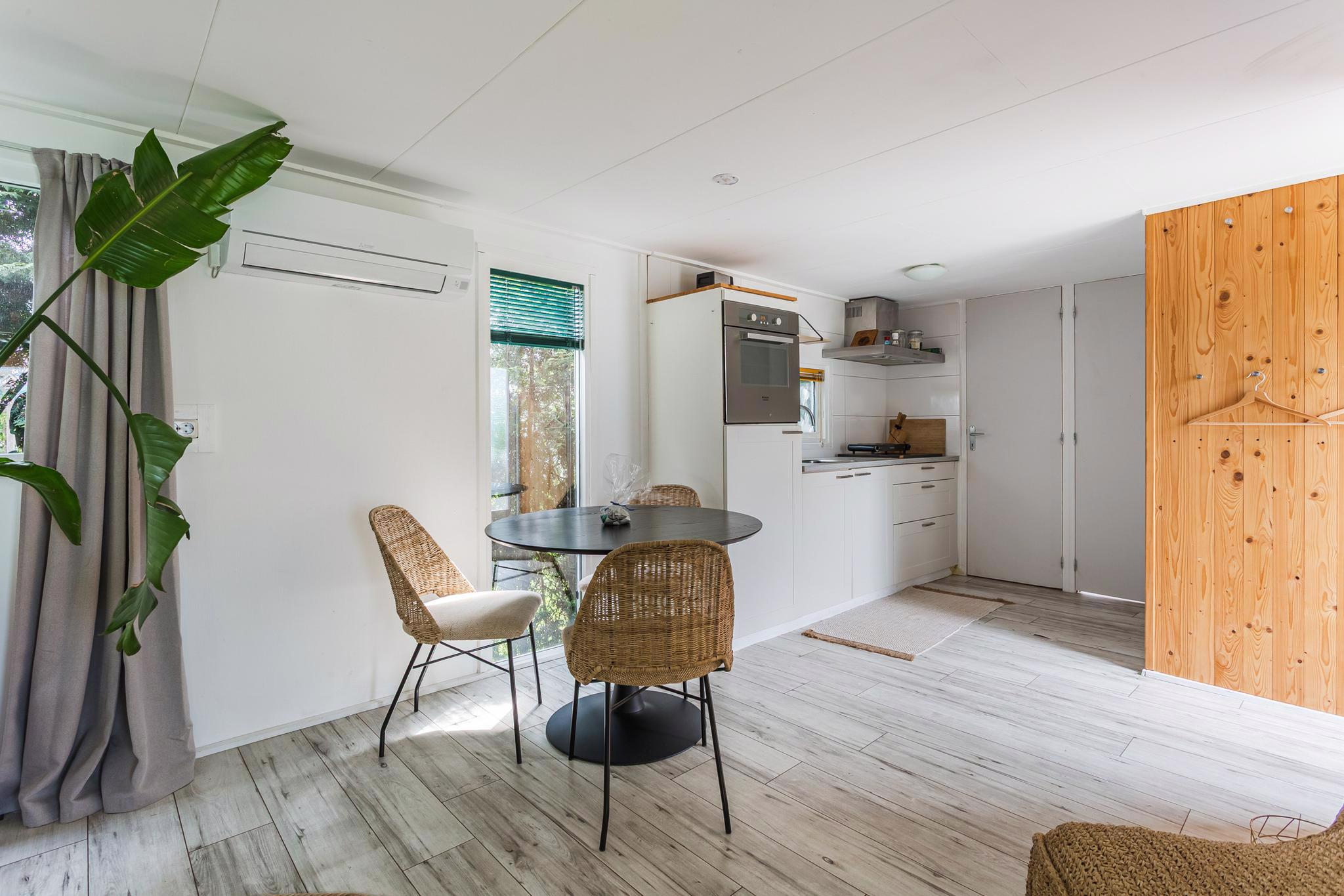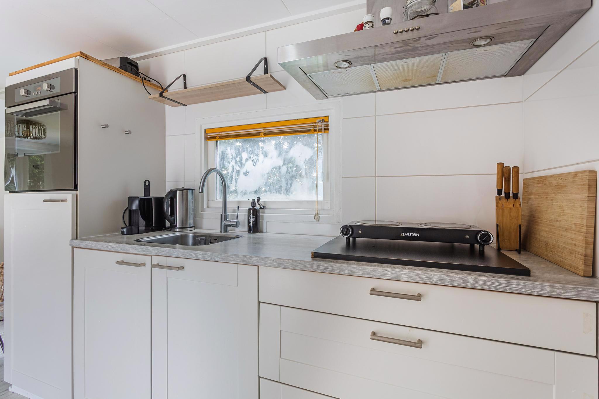 De sfeervolle en lichte woonkamer met laminaatvloer biedt een knusse zithoek en ruimte om te dineren met zicht op de tuin. Via de openslaande deuren loop je direct het terras op. De keuken is compleet uitgerust met een kookplaat, afzuigkap, koelkast met vriesvak en een heteluchtoven zodat je hier met gemak jouw favoriete gerechten kunt bereiden. Daarnaast beschikt het chalet over twee mooie slaapkamers. De eerste slaapkamer heeft een tweepersoons bed en de tweede slaapkamer wordt momenteel gebruikt als werkkamer met kastruimte. Hier kan ook heel goed een eenpersoonsbed geplaatst worden. De badkamer is in 2023 gerenoveerd en voorzien van een douche, toilet en wastafel.