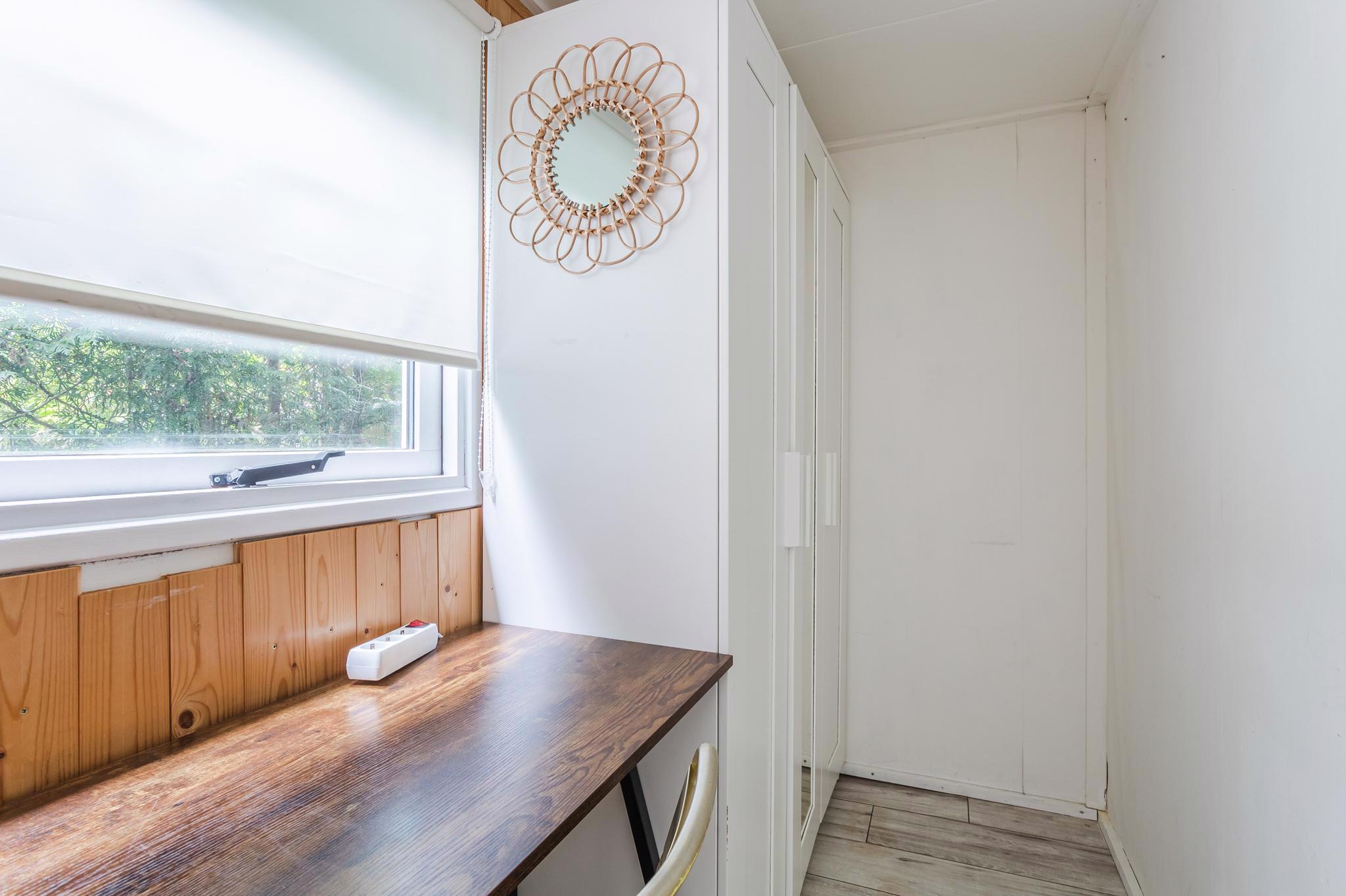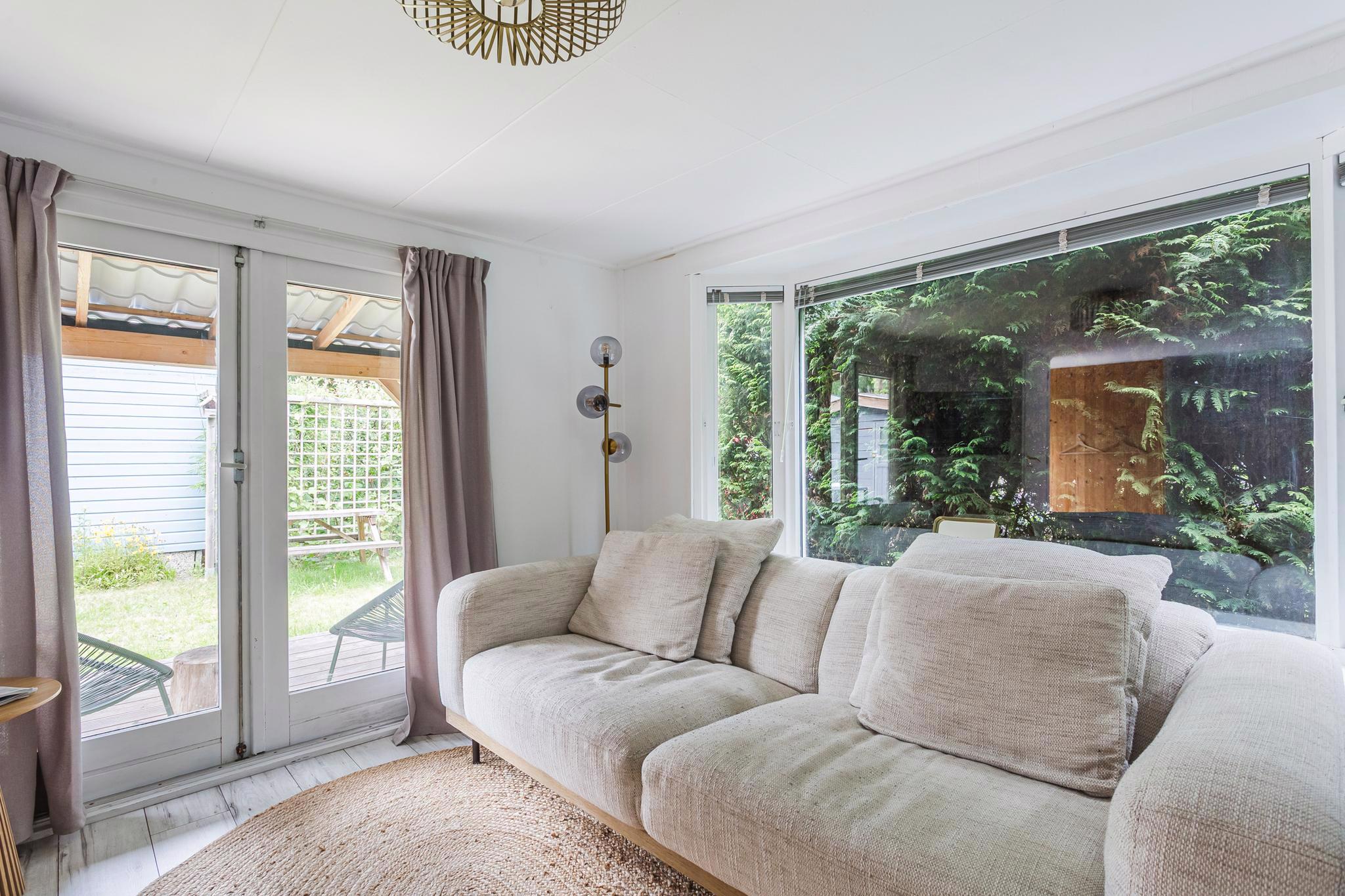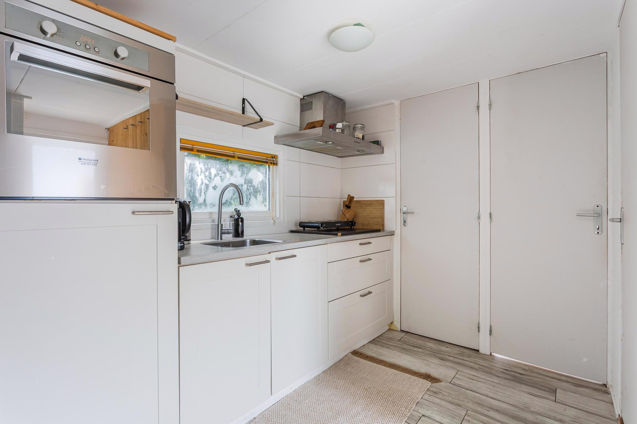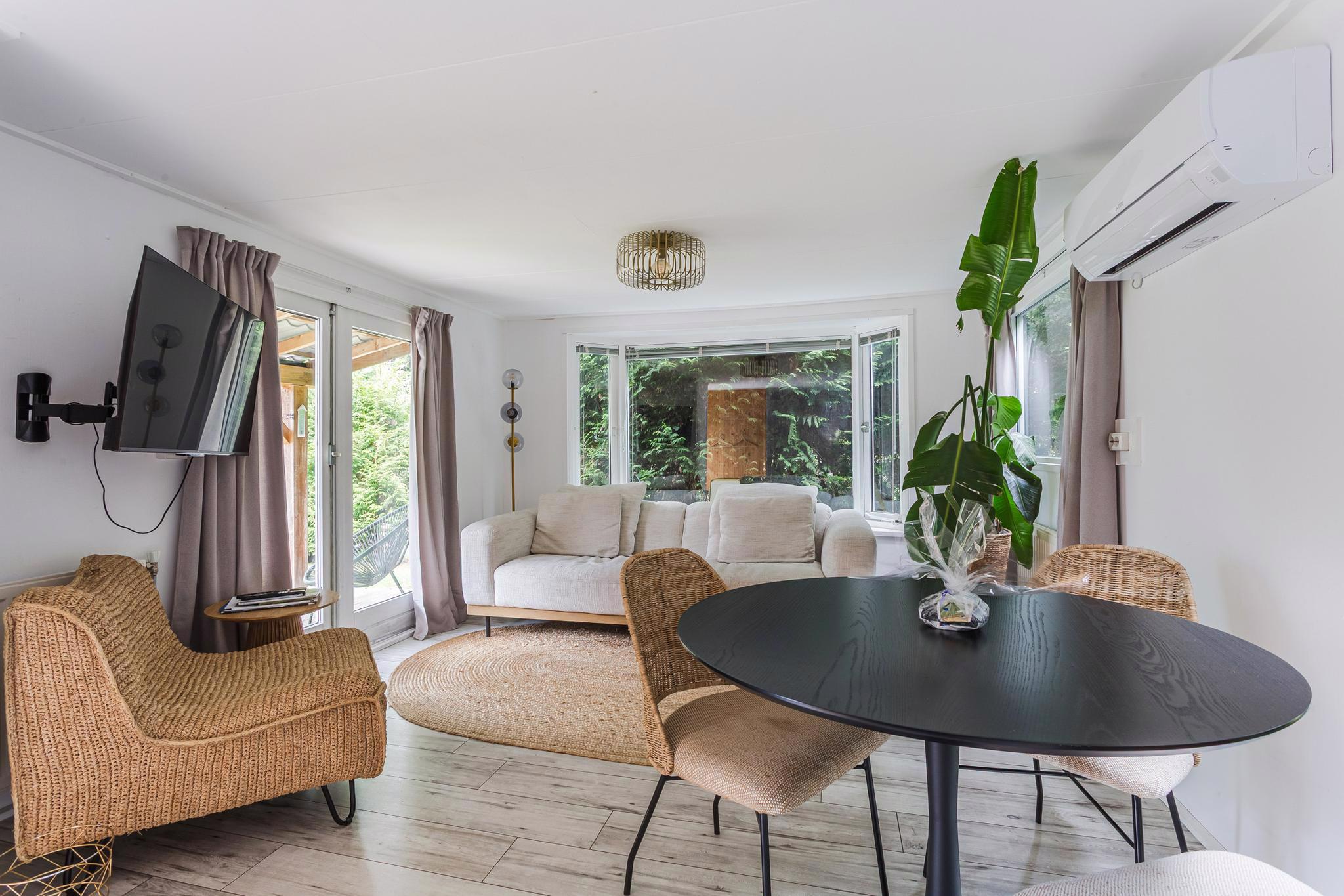 De sfeervolle en lichte woonkamer met laminaatvloer biedt een knusse zithoek en ruimte om te dineren met zicht op de tuin. Via de openslaande deuren loop je direct het terras op. De keuken is compleet uitgerust met een kookplaat, afzuigkap, koelkast met vriesvak en een heteluchtoven zodat je hier met gemak jouw favoriete gerechten kunt bereiden. Daarnaast beschikt het chalet over twee mooie slaapkamers. De eerste slaapkamer heeft een tweepersoons bed en de tweede slaapkamer wordt momenteel gebruikt als werkkamer met kastruimte. Hier kan ook heel goed een eenpersoonsbed geplaatst worden. De badkamer is in 2023 gerenoveerd en voorzien van een douche, toilet en wastafel.