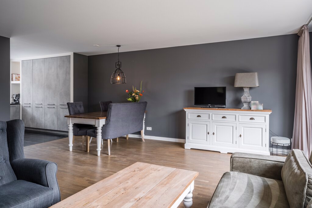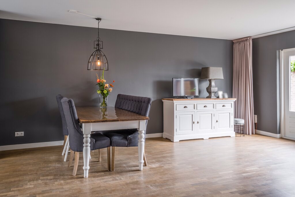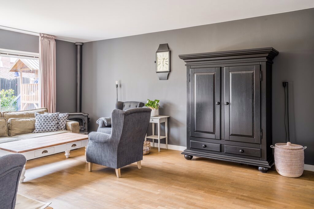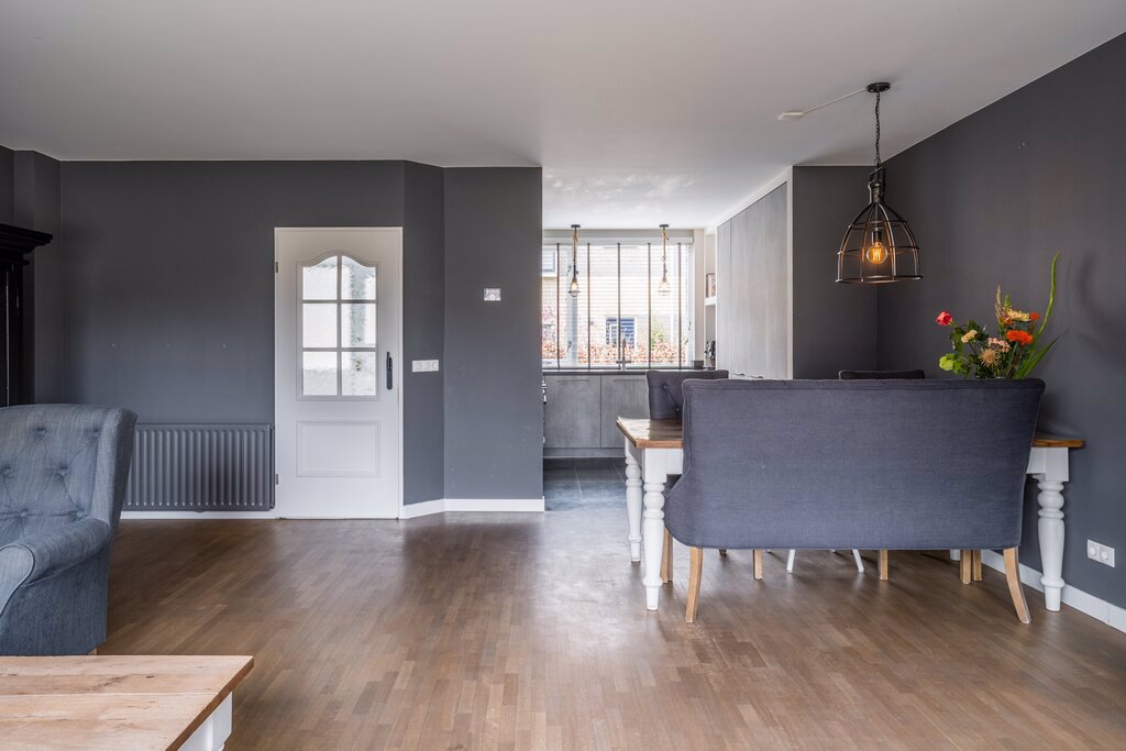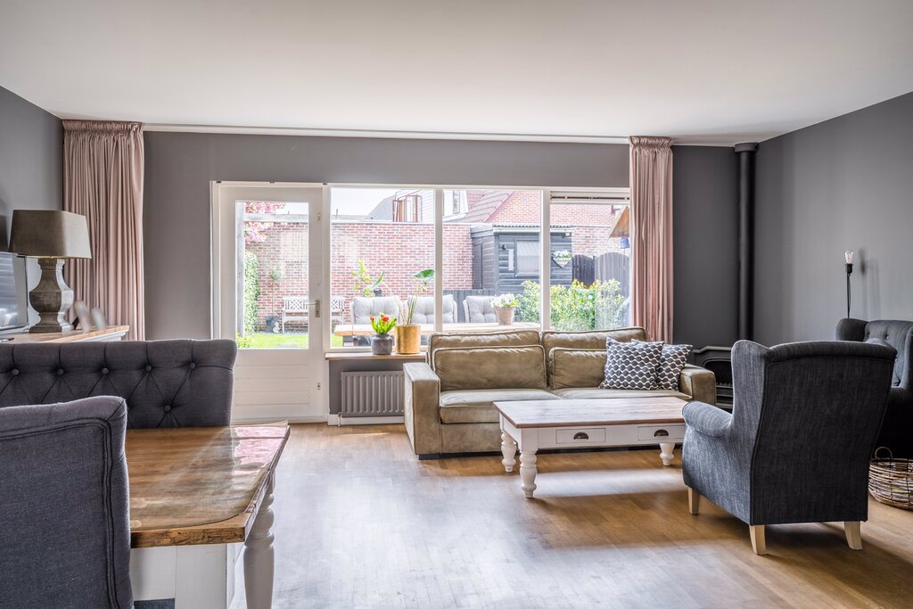 De woonkamer is voorzien van een houten vloer en een gashaard. Door de grote raampartij heb je zicht op de achtertuin.
