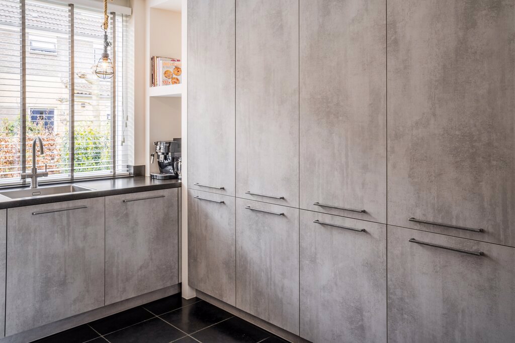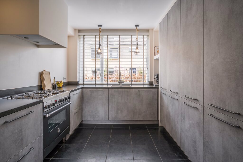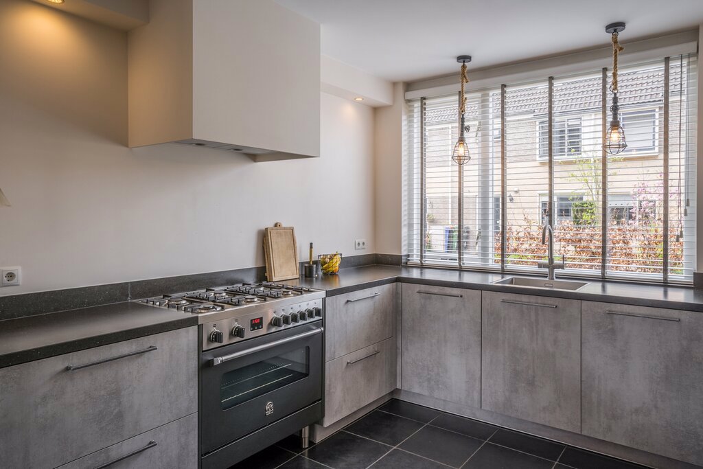 De moderne open keuken ligt aan de voorkant van de woning en biedt enorm veel berg- en werkruimte. De keuken is voorzien van een 6-pits gasfornuis met oven, afzuigkap, koelkast, vriezer, vaatwasser en een composieten aanrechtblad.