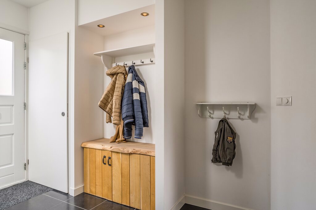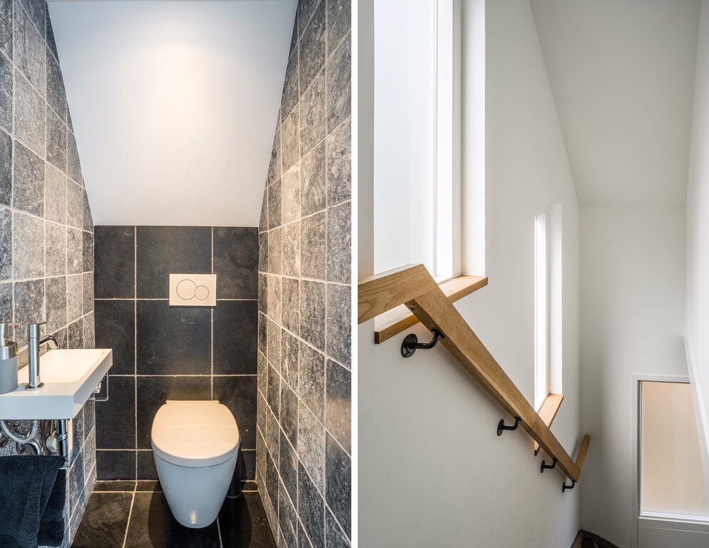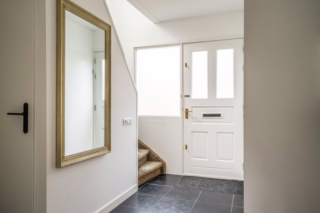 Bij binnenkomst in de hal valt direct de goede afwerking op: gestucte wanden en plafonds, vernieuwd toilet en fraaie houten trapleuningen.