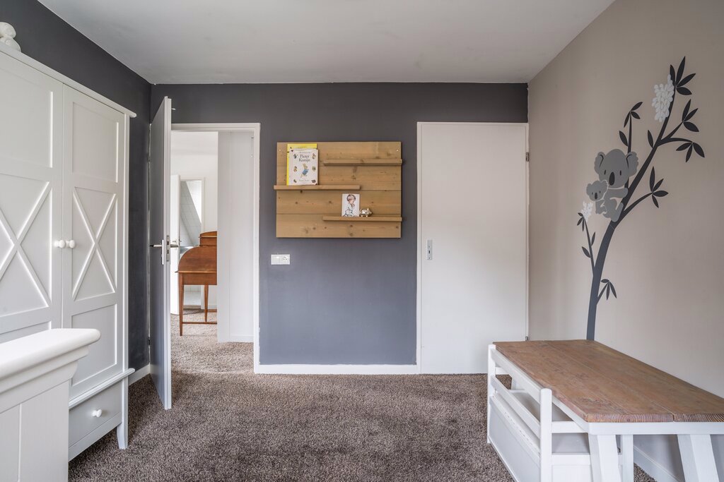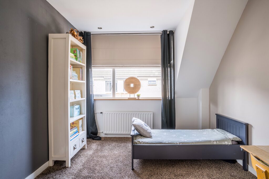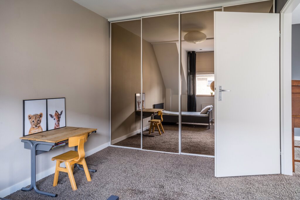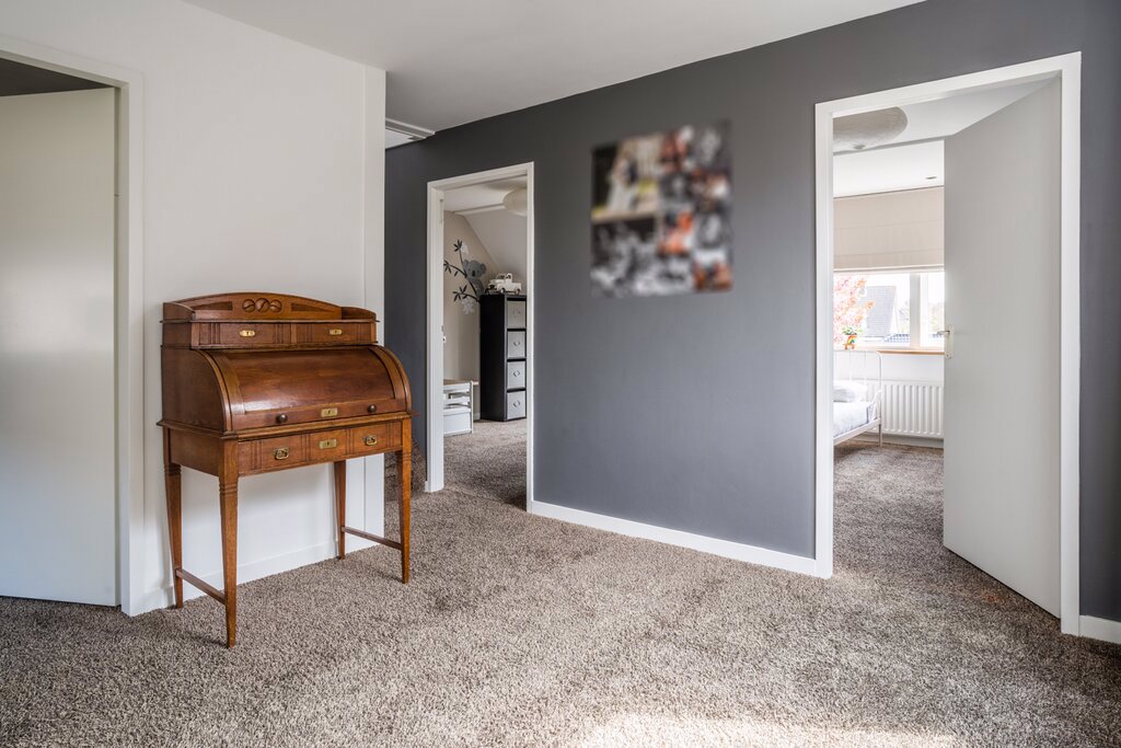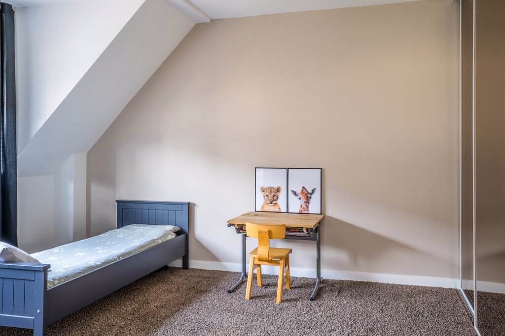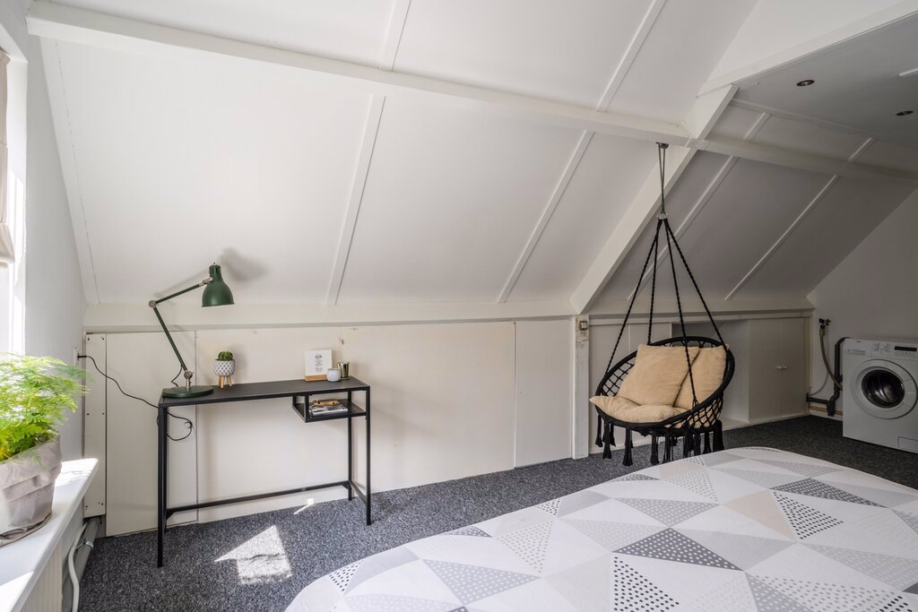 Op de 2e verdieping is een vierde slaapruimte gerealiseerd. Hier is ook plek voor de wasmachine en wasdroger. Achter de schuine kanten is bergruimte te vinden.