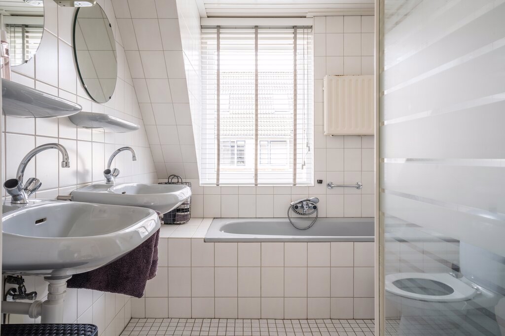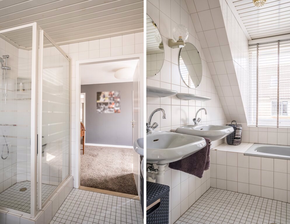 De ruime overloop biedt toegang tot 3 royale slaapkamers en een badkamer. De badkamer is tot bovenaan betegeld en heeft 2 wastafels, een bad, douche en toilet.