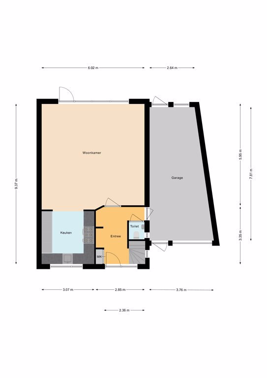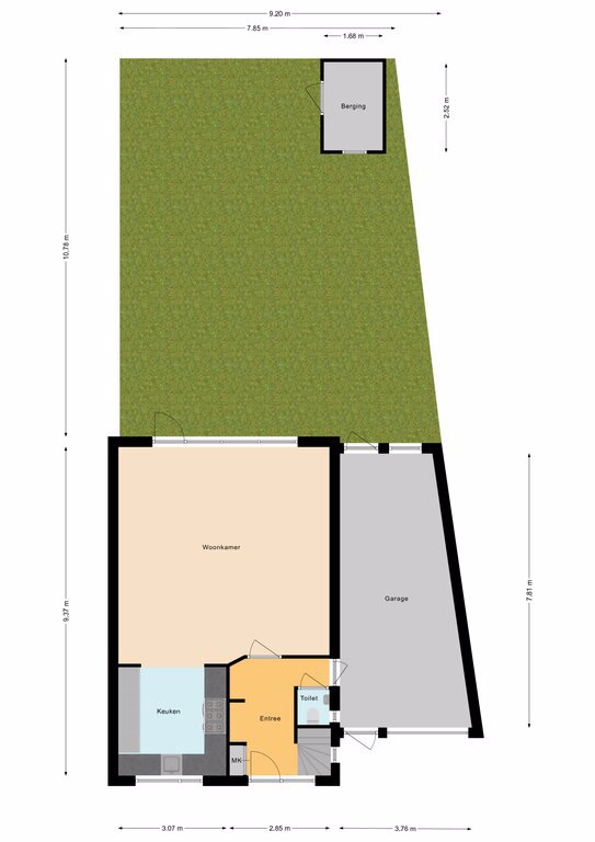 De garage is binnendoor vanuit de hal te bereiken. Deze is ook via de voorkant en achtertuin bereikbaar. De cv-ketel is hier te vinden. De voortuin is verzorgd aangelegd met een brede oprit. De achtertuin ligt op het oosten en achterin de tuin is een houten berging gebouwd.